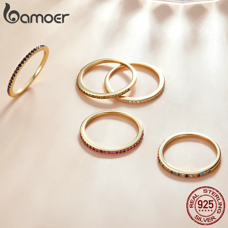 Женское Обручальное Кольцо BAMOER, простое геометрическое кольцо из стерлингового серебра 925 пробы с золотым покрытием и кристаллом