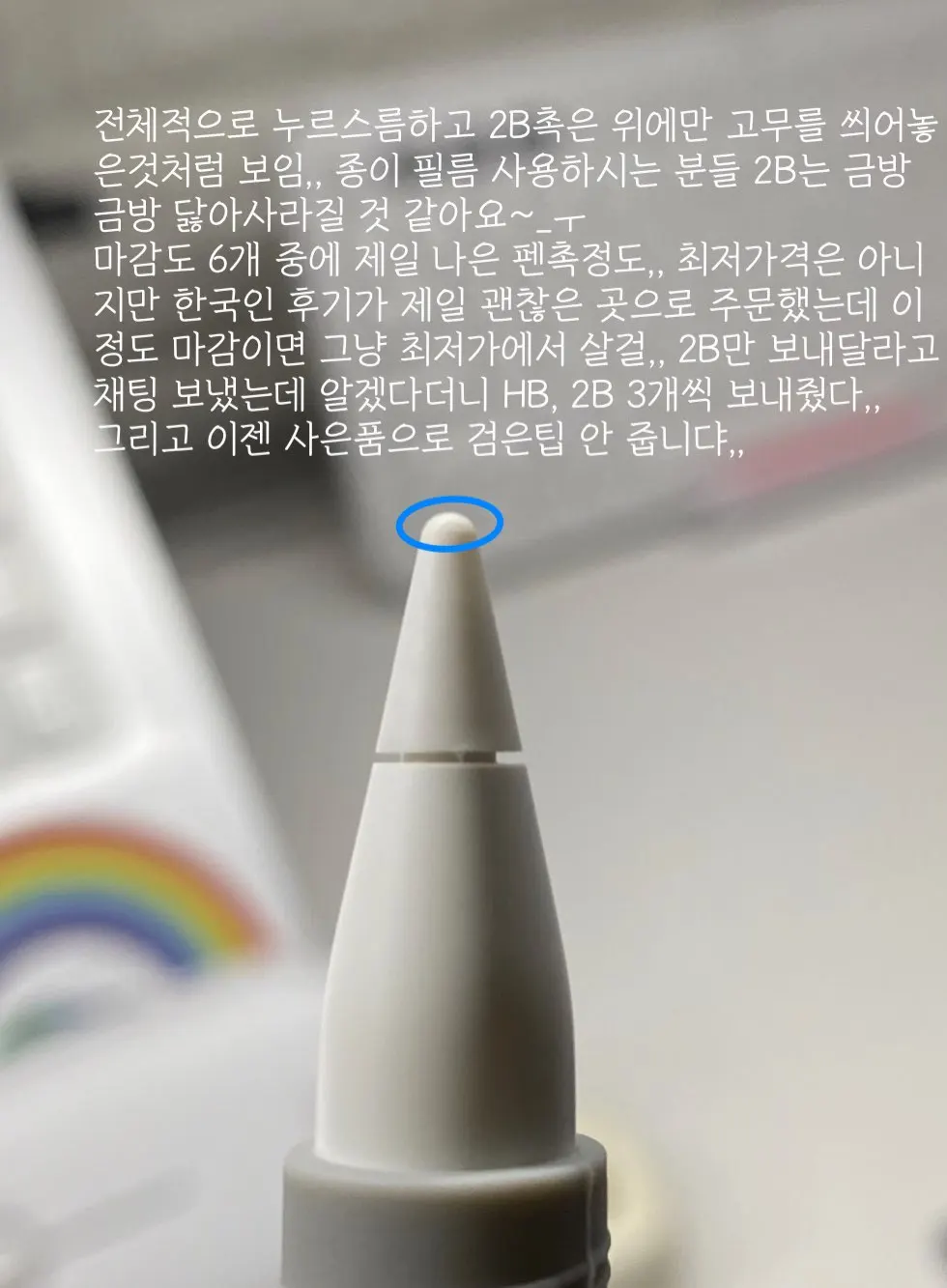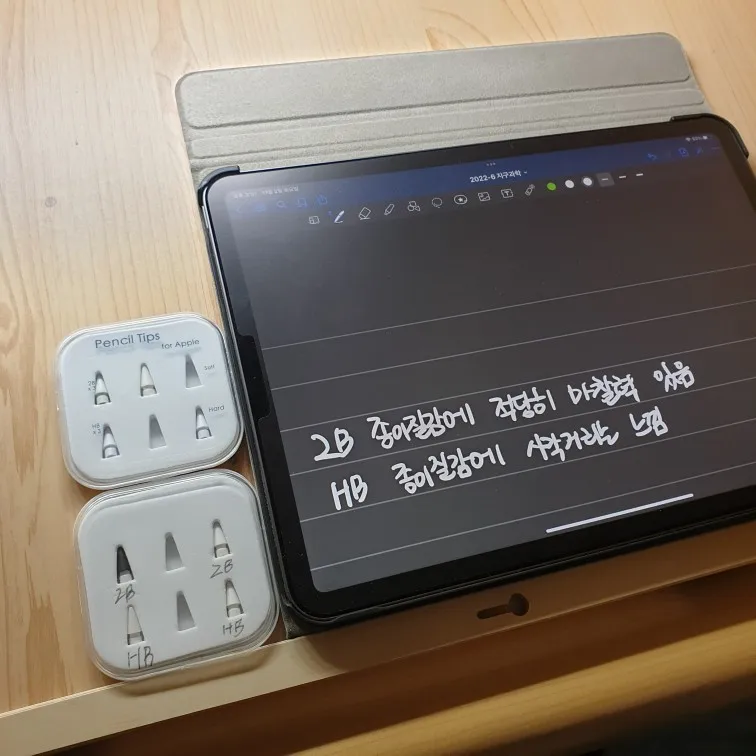 생패드에 생펜슬로 필기를 많이 하는 편인데 미끄러운 것 같아서 구매했습니다. 단단한 고무 재질이고 기존 펜촉보다 아주 약간만 부드러운 정도입니다! 2B가 제가 딱 원하는 필기감이라 아주 만족해서 사용하고 있습니다 크기와 모양은 정품과 거의 유사해서 그냥 보면 구별이 안 갈정도입니다. 애플펜슬로써의 기능은 완벽히 해냅니다 타 실리콘 펜촉은 필기를 많이 하는 경우 구멍이 빨리 난다고 하는데 이건 구멍이 날 걱정을 하지 않아도 될 정도의 내구성이 있는 것 같습니다