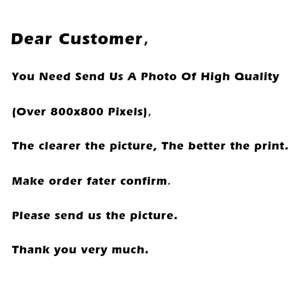 Уважаемый клиентВам нужно отправить нам фотографию высокого качества (более 800x80 0 пикселей)Чем четче изображение, тем лучше принт.Подтвердите отправку заказаПожалуйста, отправьте нам картинкуБольшое спасибо.