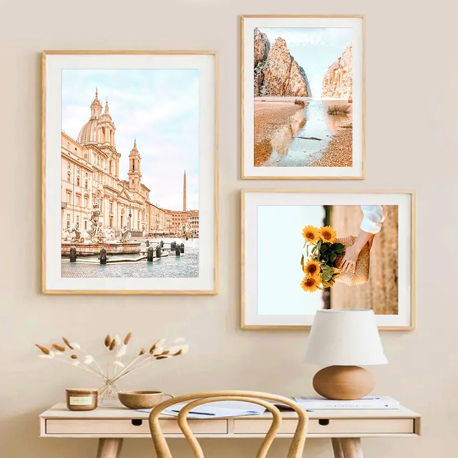 Настенные картины с изображением розовых цветов, пляжа, дома, двери...