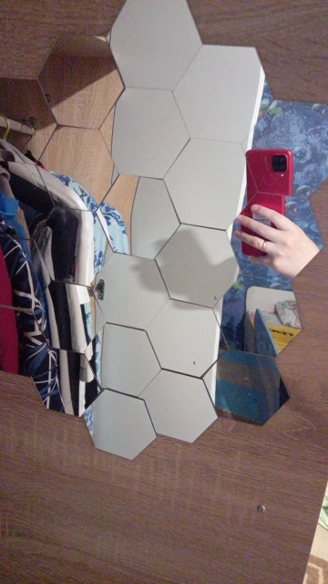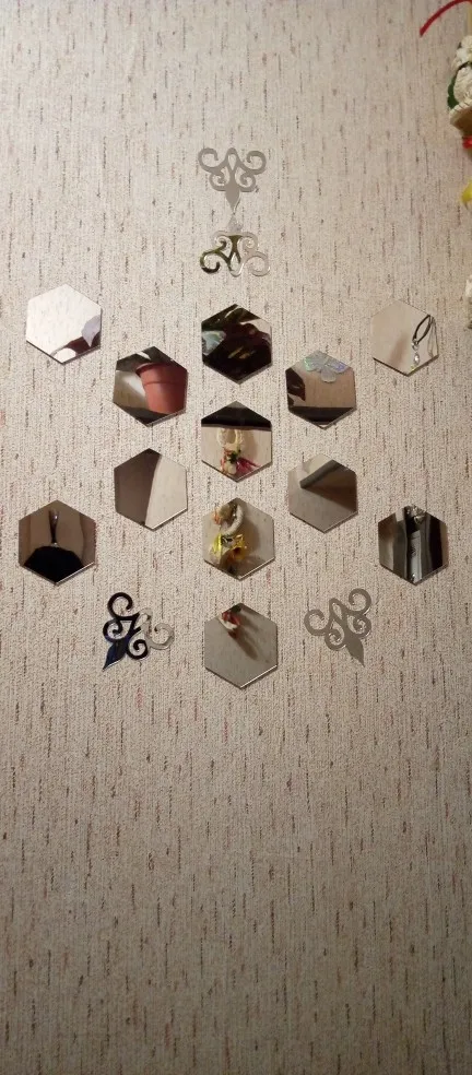 Размер маленький, я заказала 24 штуки. Но хватило на маленькое зеркальце) Отражают по отдельности хорошо, но вместе искажают изображение. Они не самоклеющиеся, с ними продавец досылает двусторонние клейкие кружочки. Прекрасно подойдут для декора, но совершенно не подходят для роли зеркала.