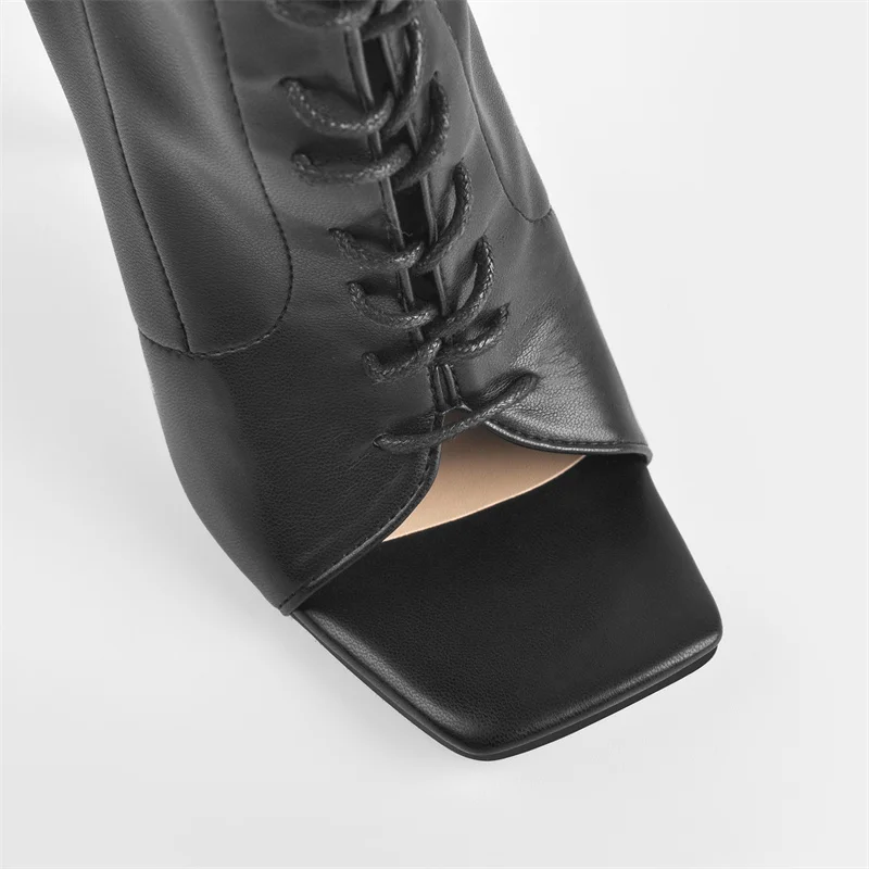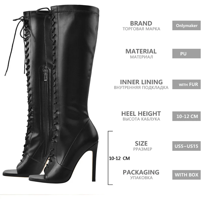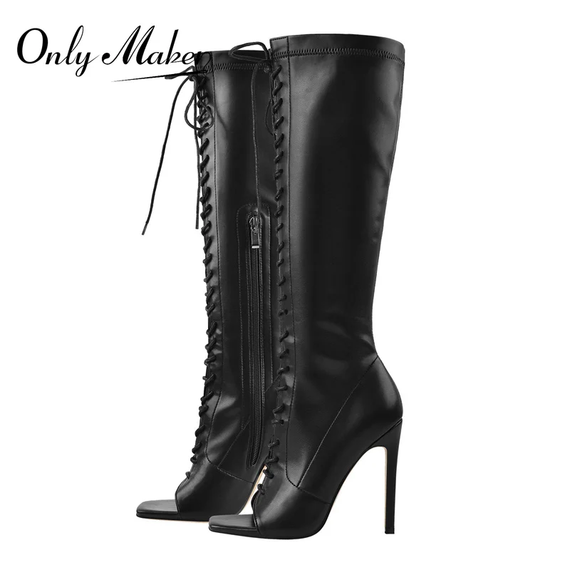 Босоножки Onlymaker черные матовые на высоком каблуке, Босоножки с открытым носком, на шнуровке, боковая молния, большой размер, боковая молния