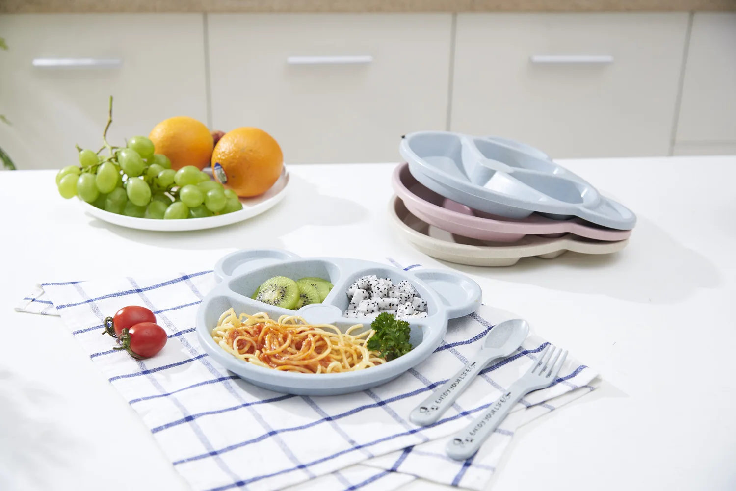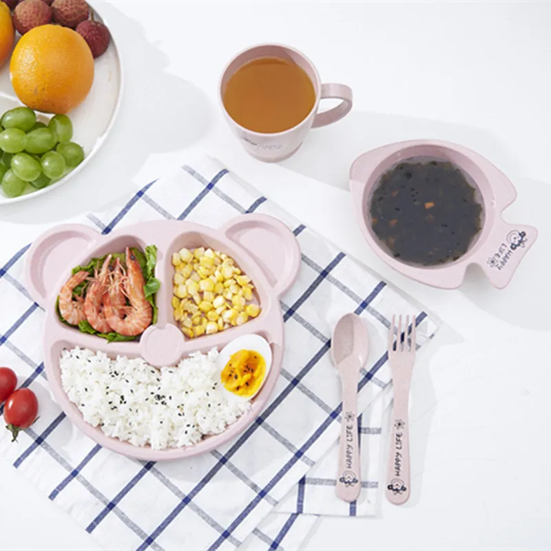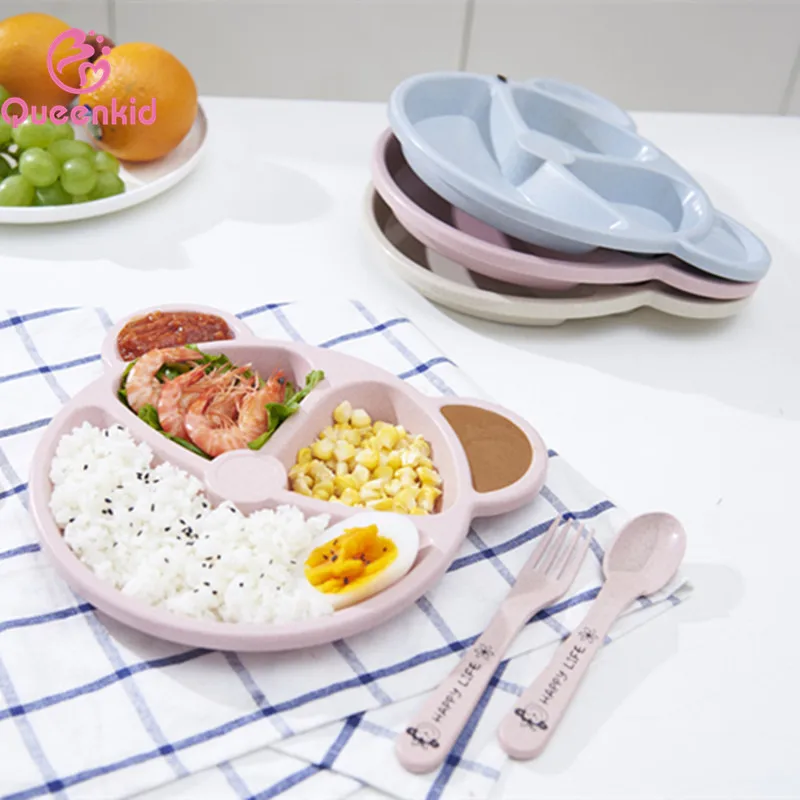 Детская обеденная тарелка из трех предметов с ложкой и вилкой, тарелка из пшеничной соломы, разделенная тарелка для детского сада с каплями