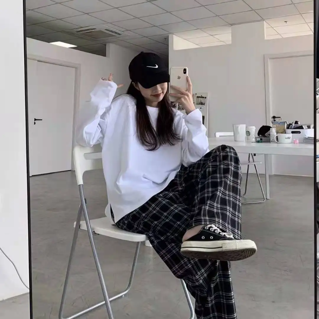 Прямая поставка, клетчатые брюки в стиле Харадзюку для женщин, брюки 2021, уличная одежда, свободные широкие брюки, летние женские повседневные брюки оверсайз