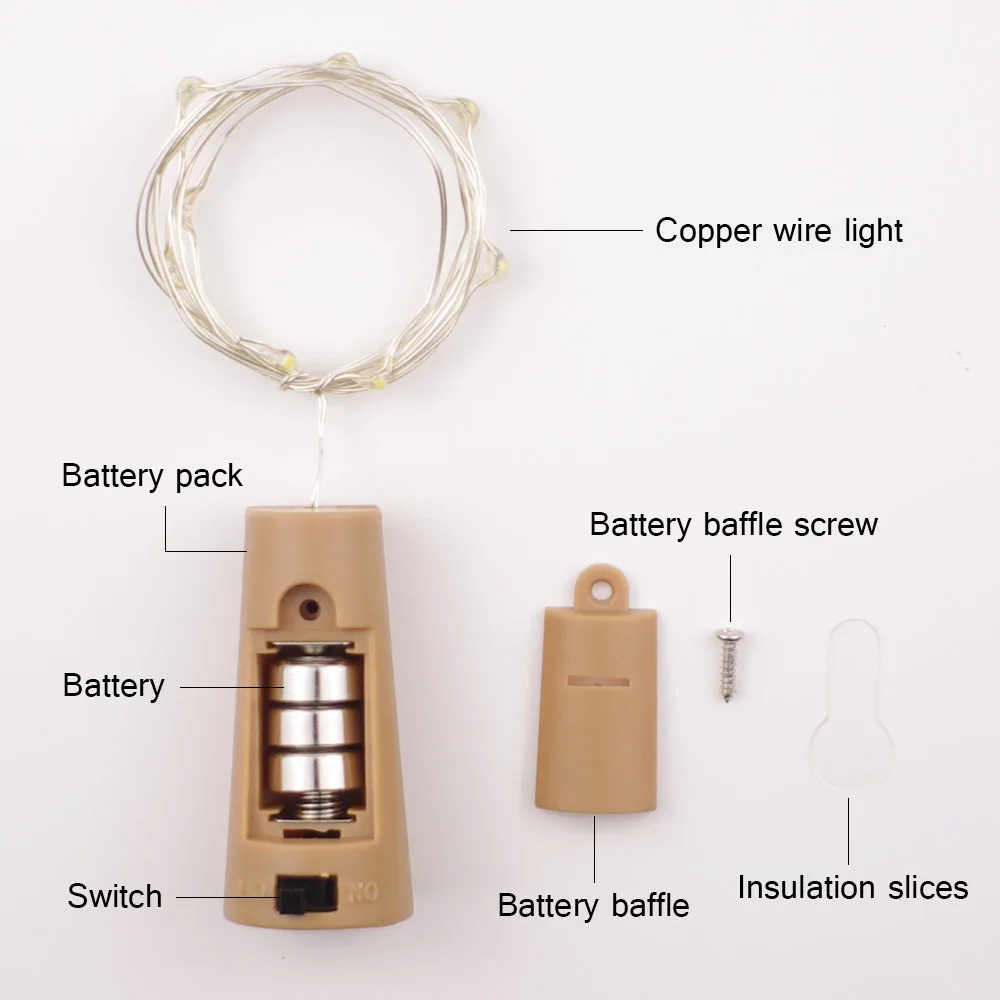 Параметры продукта:Материал: металл + пластикФорма: пробкаДлина шнура: 1 м/2 м/3 мСветодиодный лампы Кол-во: 10/20/30 лампыСветильник: синий/многоцветный/белый/теплый белыйИсточник питания:3 * AG13/LR44Аккумулятор(Батареи не установлены)Посылка включает в себя:6x пробковый светильник для бутылки