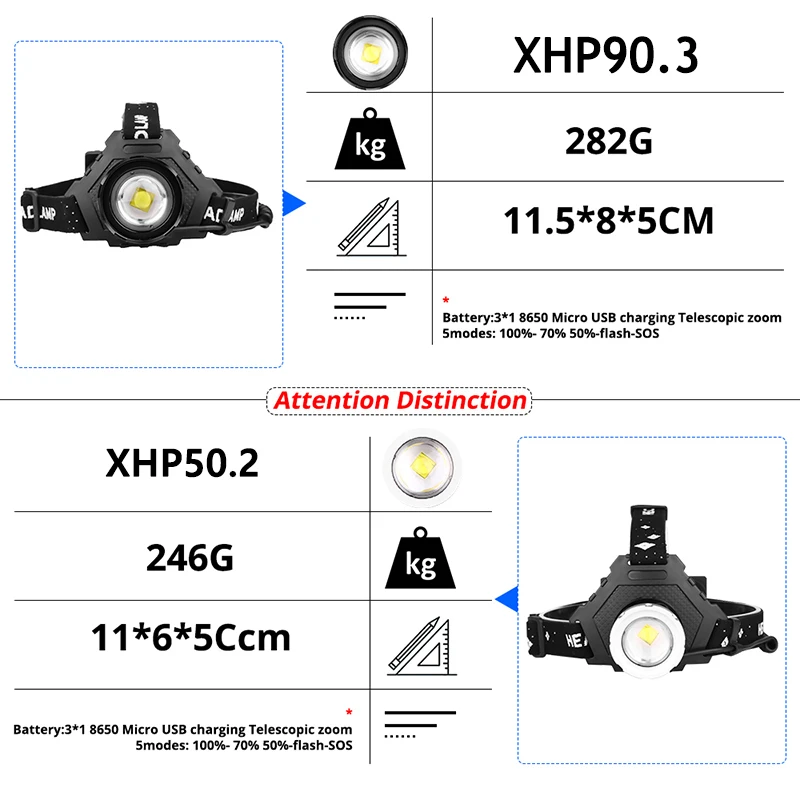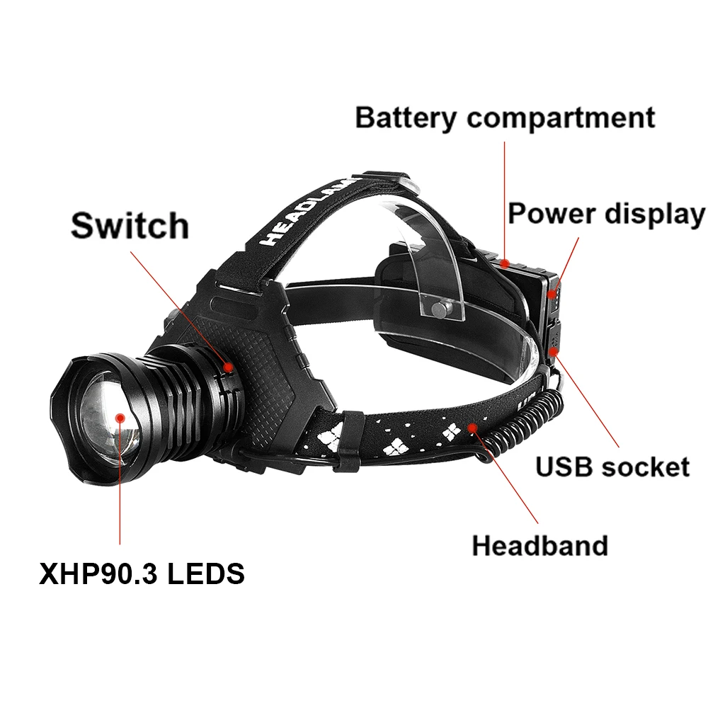 Новинка самый мощный перезаряжаемый налобный фонарь USB светодиодный налобный фонарь 18650 Водонепроницаемый налобный фонарь XHP90.3 зум охотничий налобный фонарь