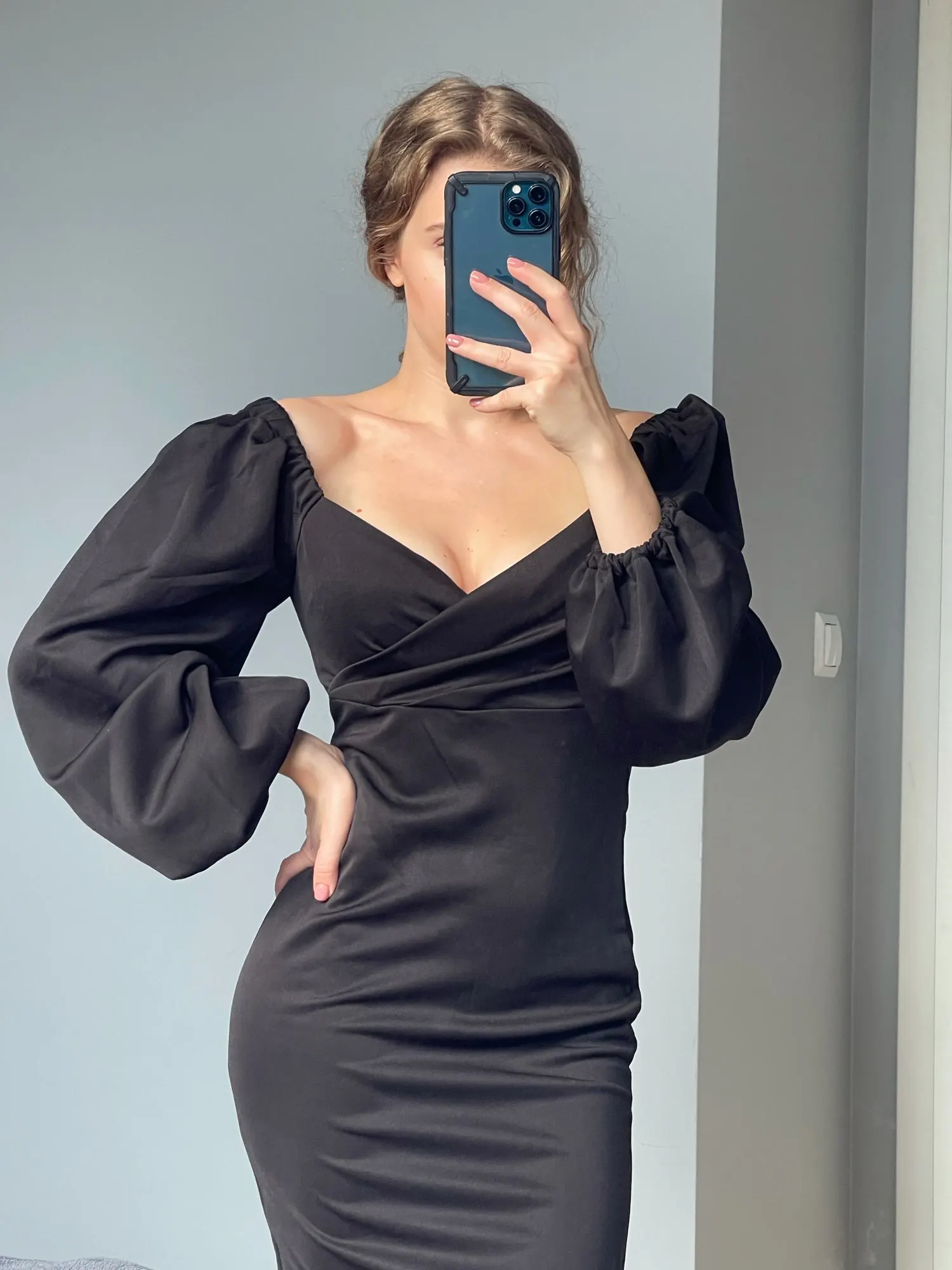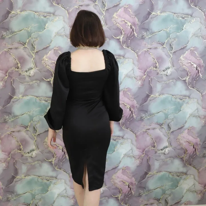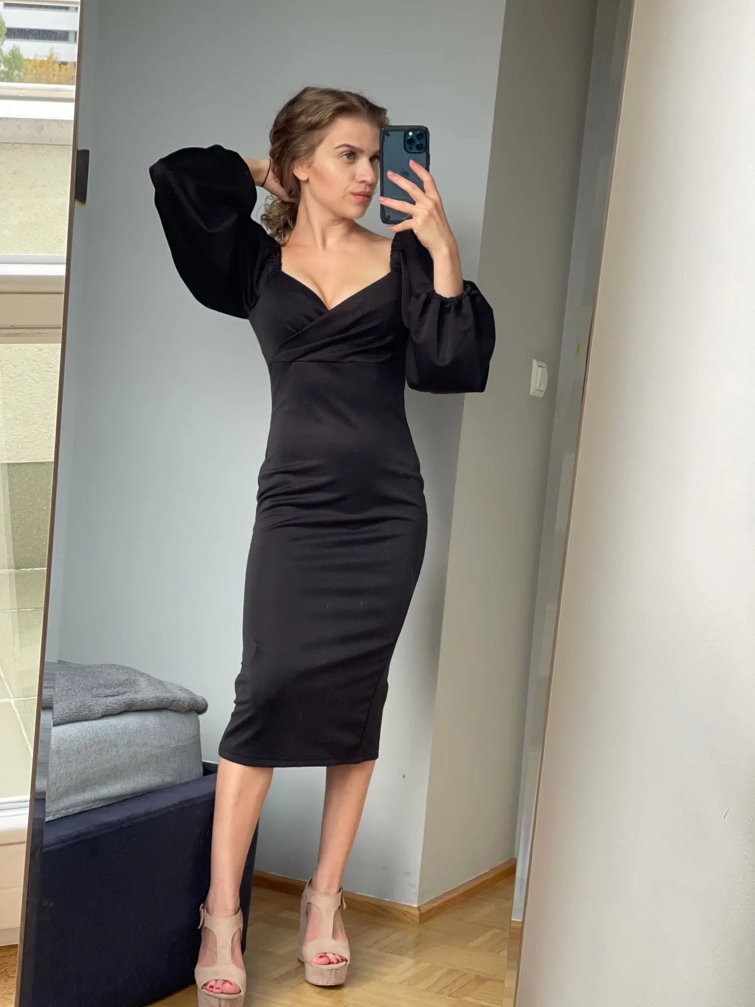 Красивое, стильное платье. На параметры 87-62-90 см и рост 163 см, заказала в размере S, село отлично,по фигуре. Ткань тянется, подойдёт и на бОльшие параметры. Пошив аккуратный, швы и строчки ровные, торчащих ниток не было. Материал полиэстр, спандекс к телу и на ощупь приятный. Рукава фонарики, сзади разрез.