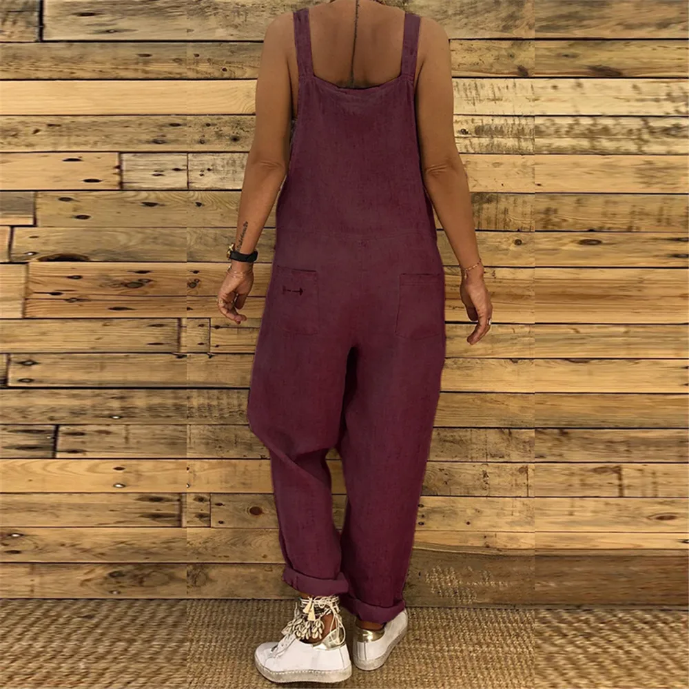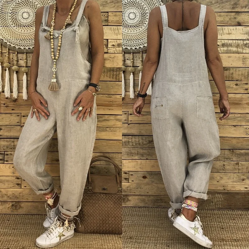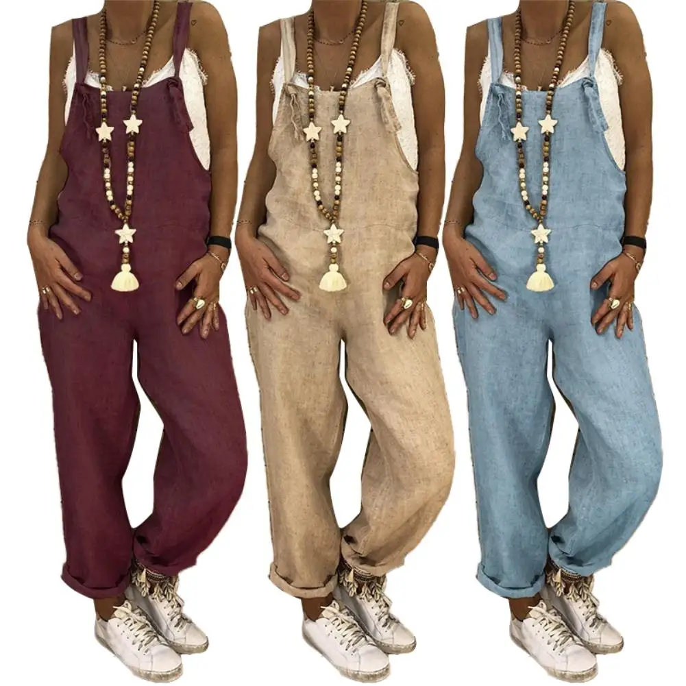Женский свободный комбинезон на бретельках, летний Повседневный однотонный длинный комбинезон без рукавов, модель 2021 года, женские Винтажные льняные комбинезоны