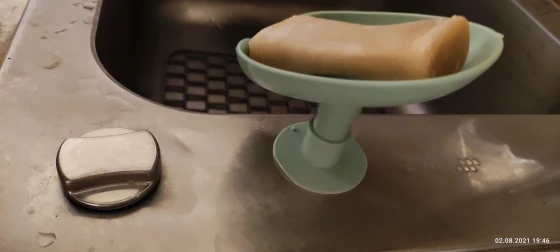 прикольная мыльница. очень понравилась форма и то, что вода в ней не копится, а сливается в раковину. на первый вид присоска показалась плохой, но в результате мыльница отлично крепится на раковине. заказал еще 2 таких.