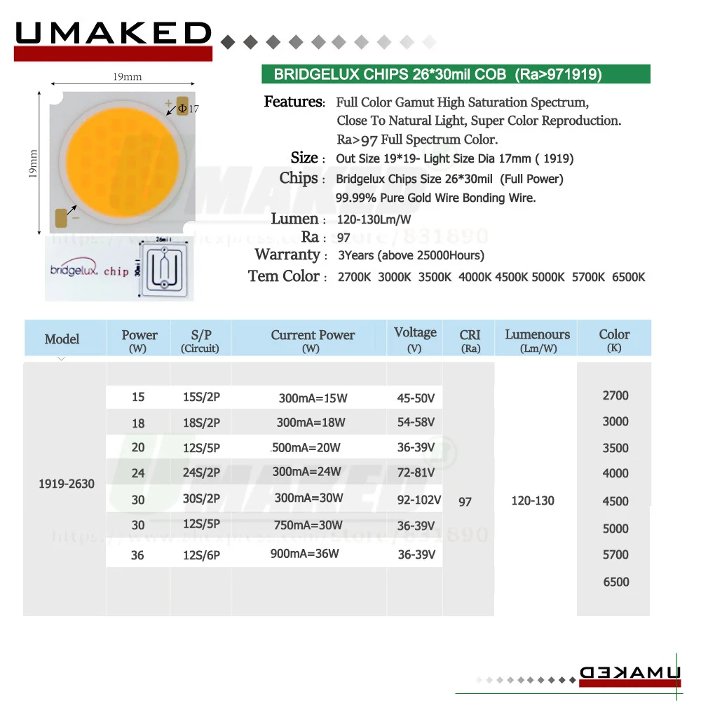 Чипы Светодиодные полного спектра, COB 3, 5, 7, 10, 12, 15, 18, 20, 30, 36 Вт, Ra97, 130 лмВт, 1313, 1919, 3000-4000-5000K