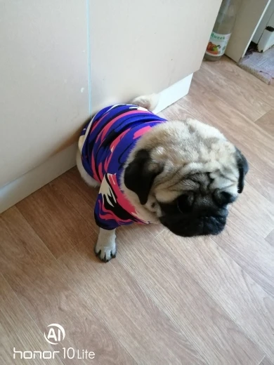 Отличная теплая толстовка. Мопсу (шея 40 см, грудь 55 см, 9 кг) великолепно, только в шее туговато, зато не сползет на холку. Правда, бедная псинка позировать не хотела: в квартире +30°С,а тут еще теплую одежку напялили....
