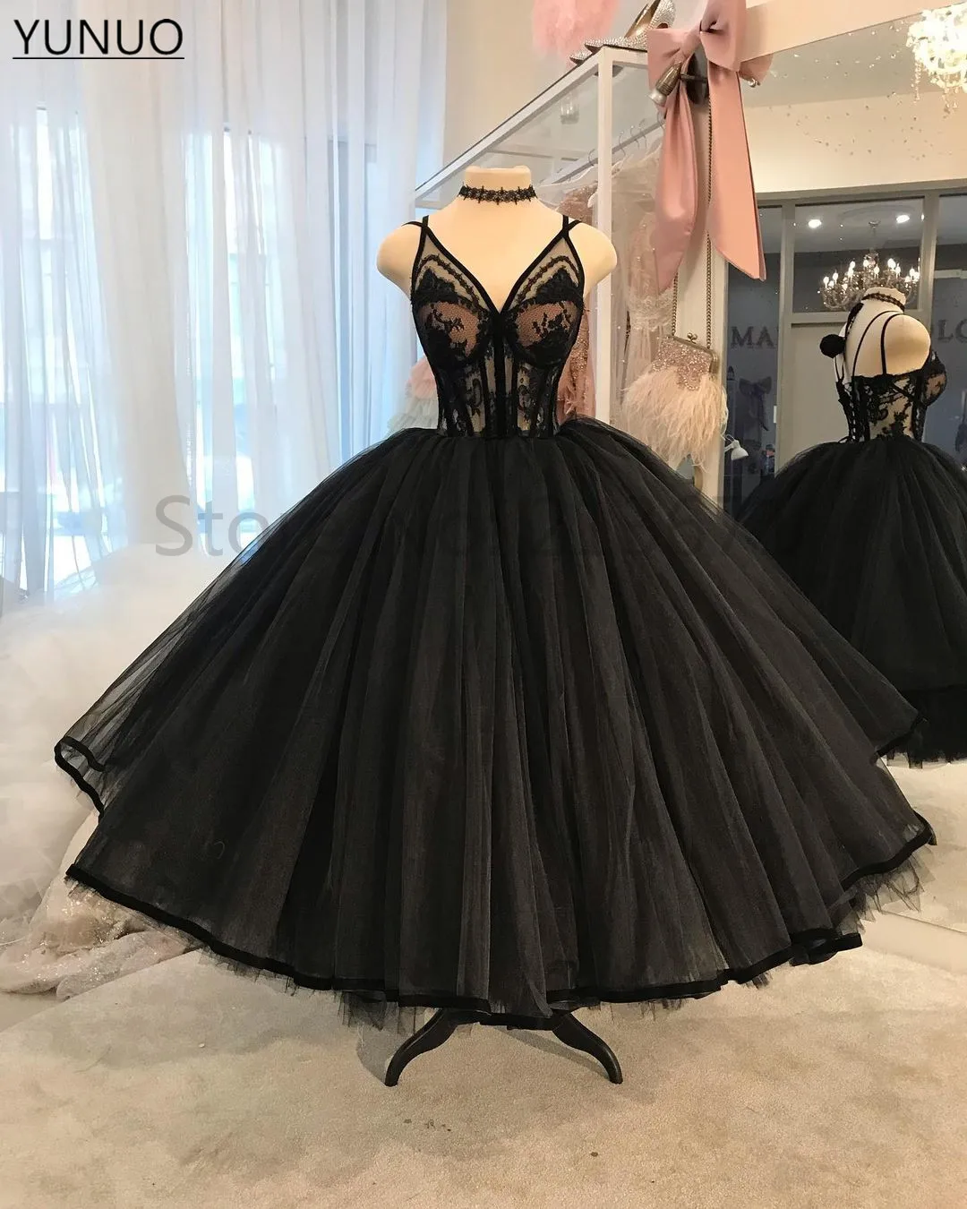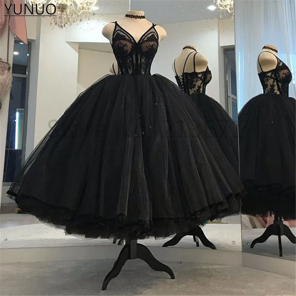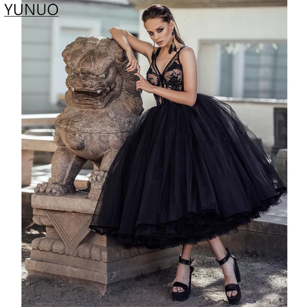 YUNUO черное бальное платье, тюлевые вечерние платья, Кружевная аппликация, V-образный вырез, Пушистый корсет, вечернее платье для выпускного вечера, длиной ниже колена