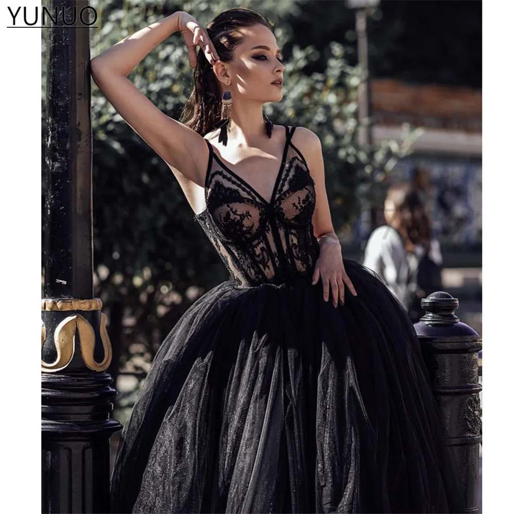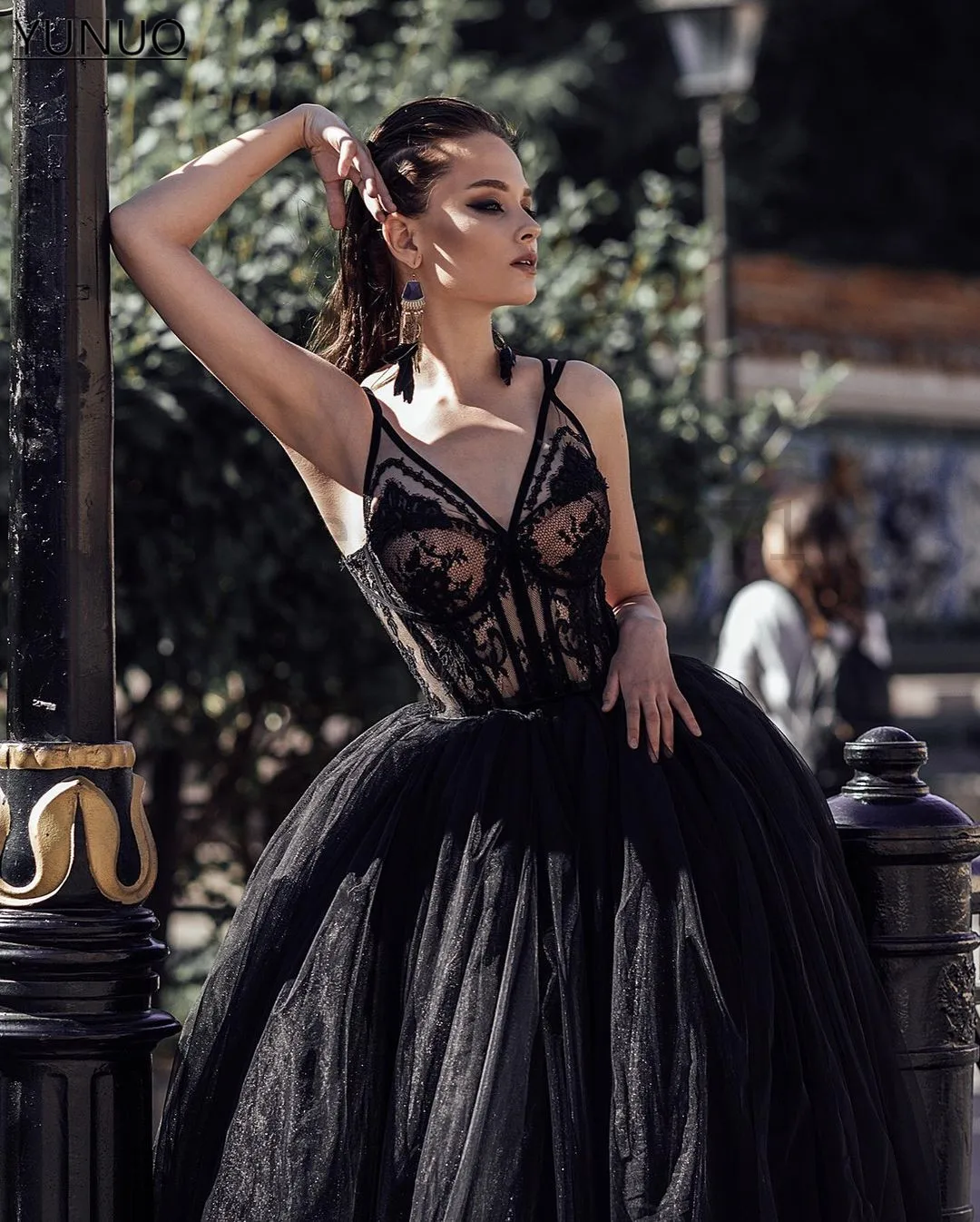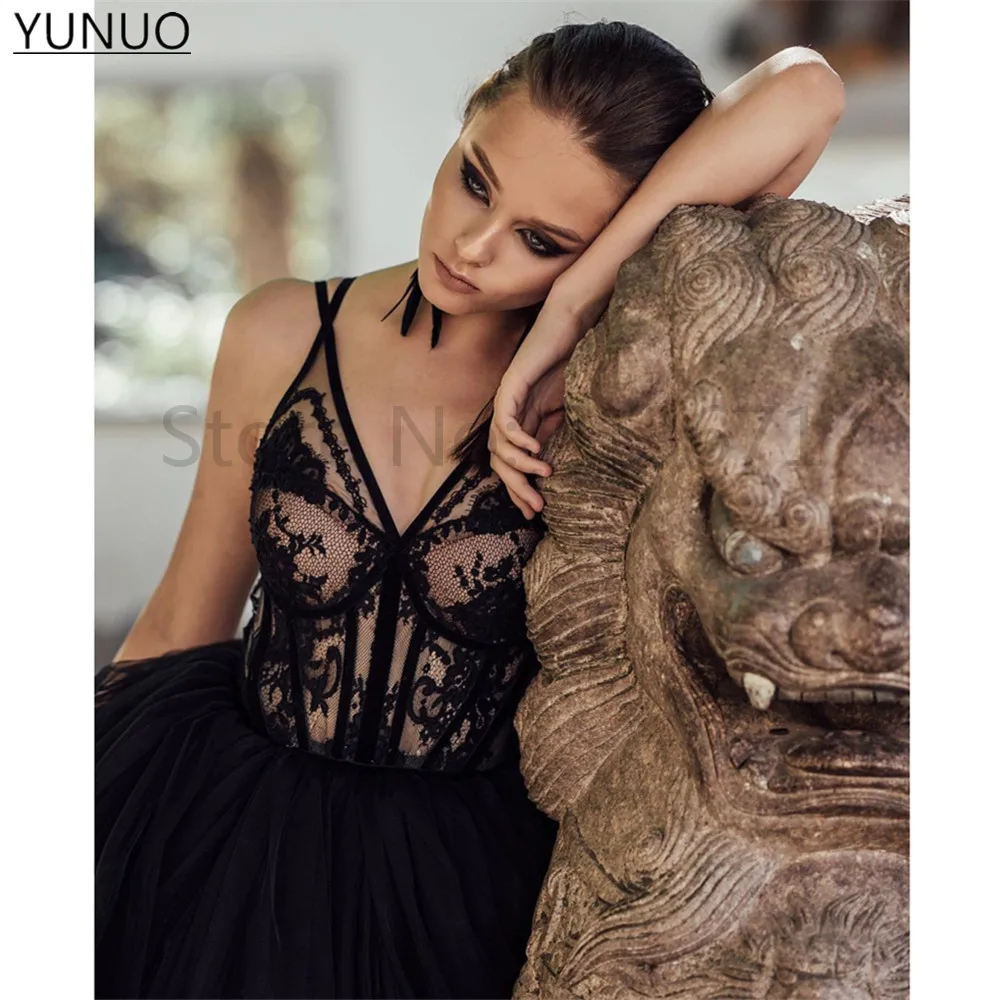 YUNUO черное бальное платье, тюлевые вечерние платья, Кружевная аппликация, V-образный вырез, Пушистый корсет, вечернее платье для выпускного вечера, длиной ниже колена