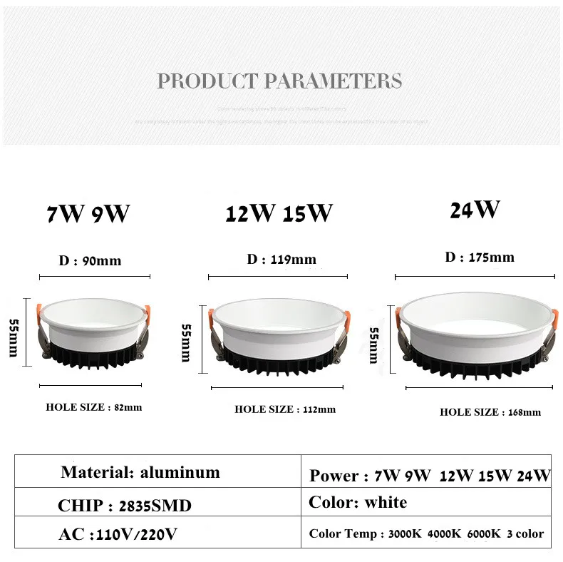 Потолочный светильник, без рамки, 3 температуры, с антибликовым покрытием, 7 Вт, 10 Вт, 12 Вт, 15 Вт, 24 Вт, Круглый, Светодиодный точечный потолочный светильник