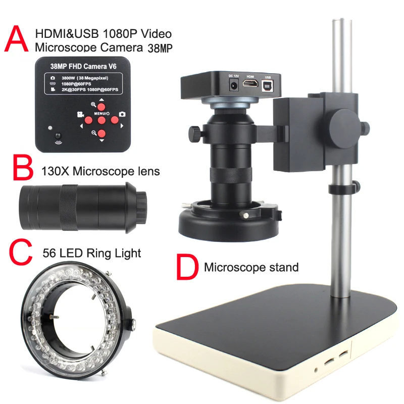 Цифровой микроскоп 38MP 60FS HDMI VGA, камера + объектив с креплением 130X C, 56 светодиодный ных кольцесветильник ламп