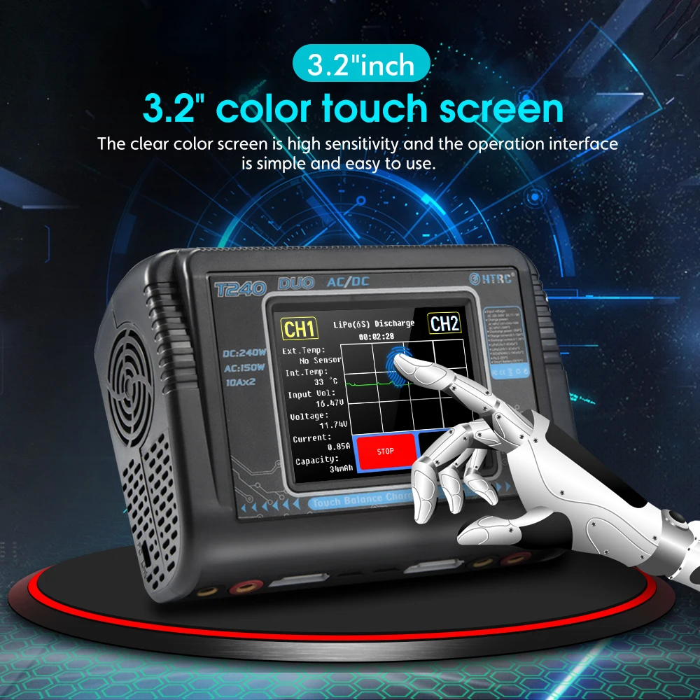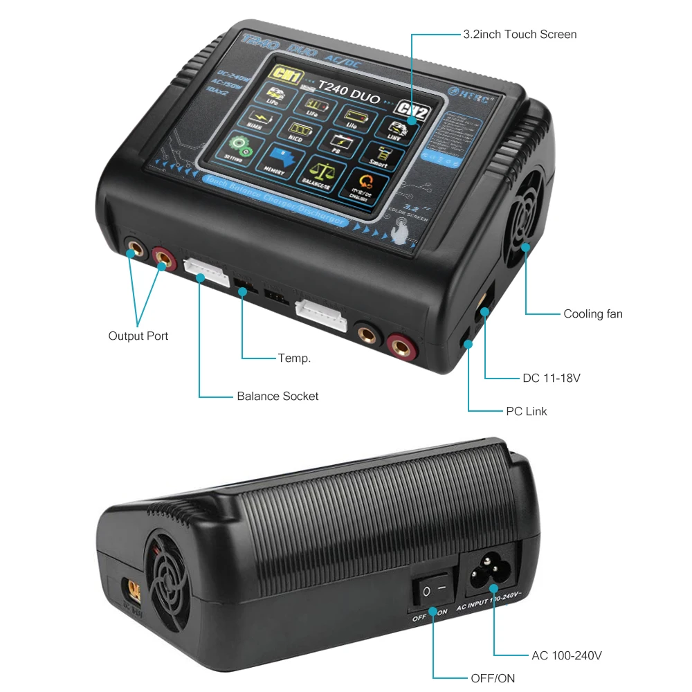 Зарядное устройство HTRC T240 Duo для литий-полимерных аккумуляторов с сенсорным экраном, 150 Вт, постоянный ток, 240 Вт, Двухканальное зарядное устройство для литий-полимерных аккумуляторов LiHV LiFe Lilon NiCd NiMH PB