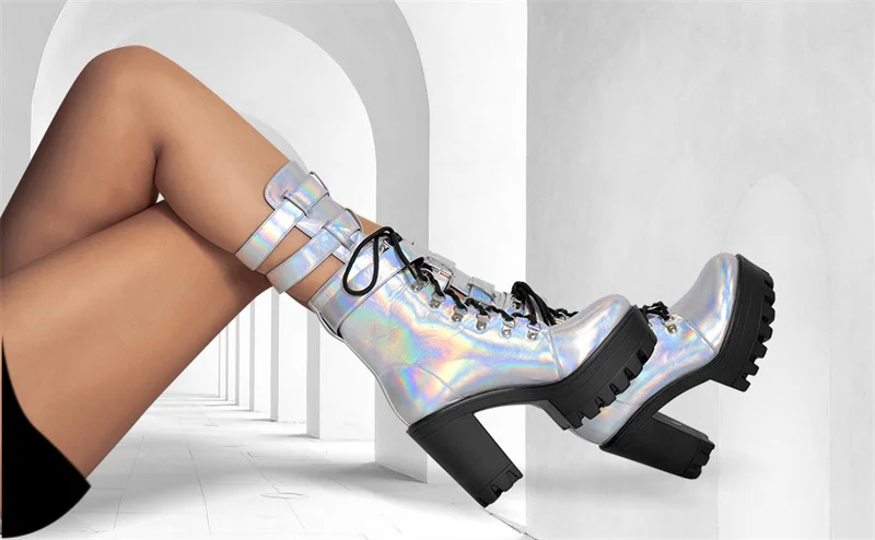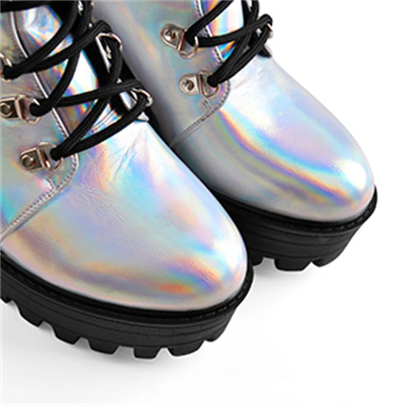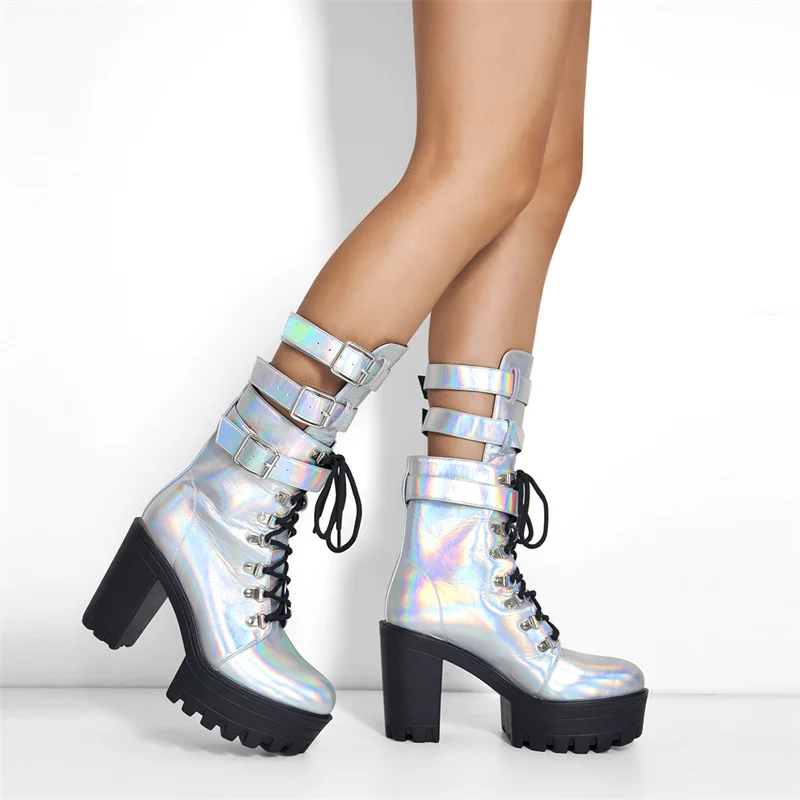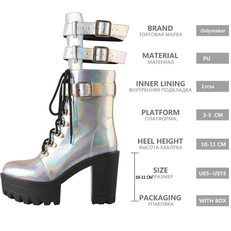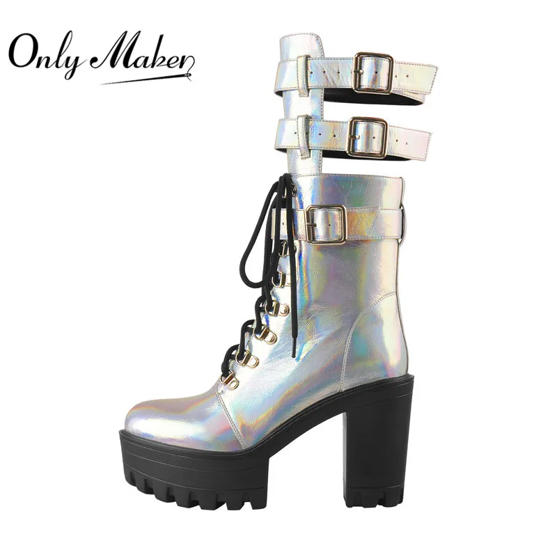 Женские ботильоны из лакированной кожи Onlymaker, разноцветные полусапожки с круглым носком на массивном высоком каблуке, на платформе, со шнуровкой и пряжкой, большие размеры