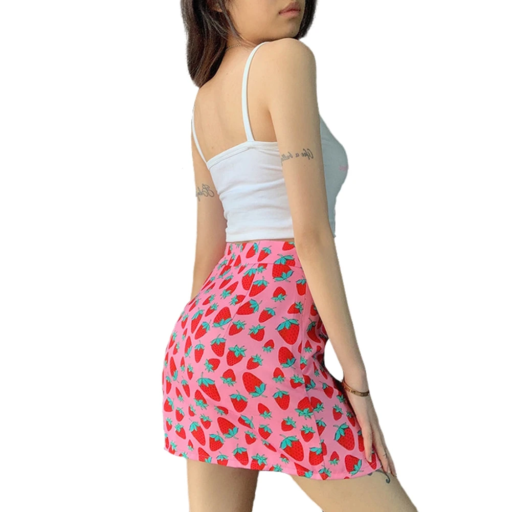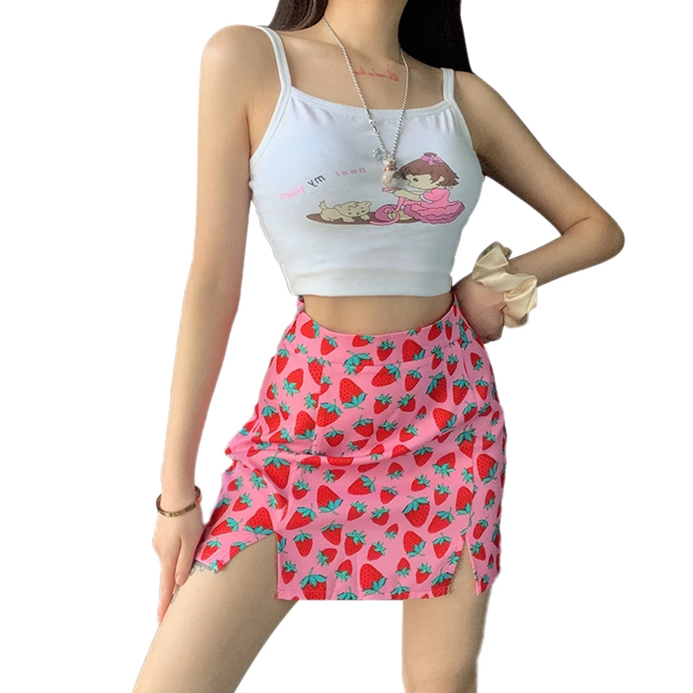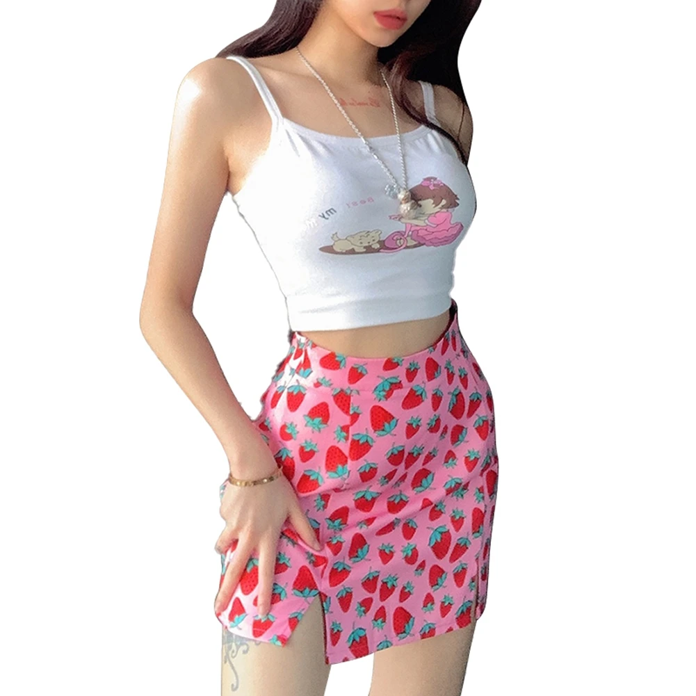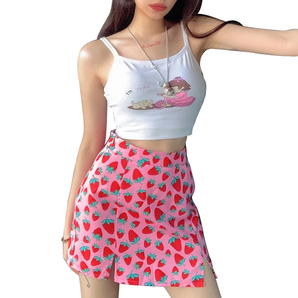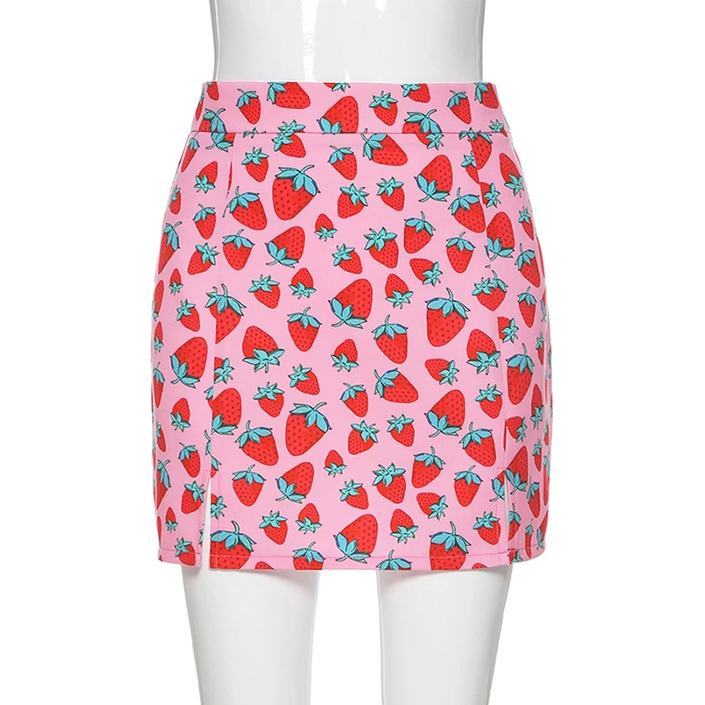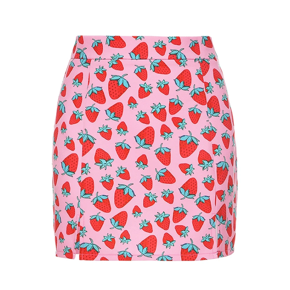 Женская юбка с завышенной талией, розовая эластичная юбка-трапеция с разрезом и принтом вишни, летняя женская юбка в стиле INS