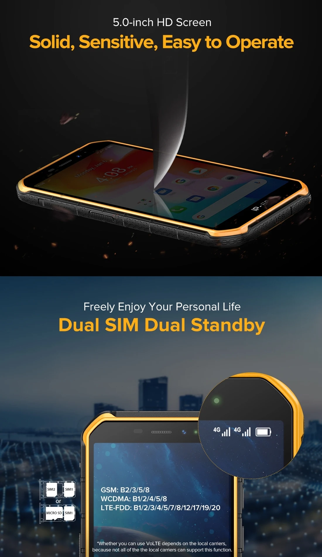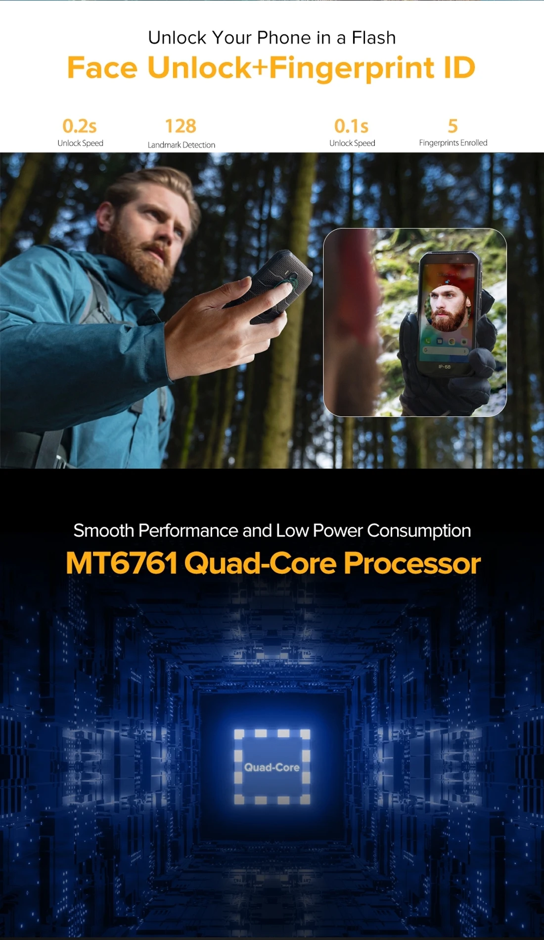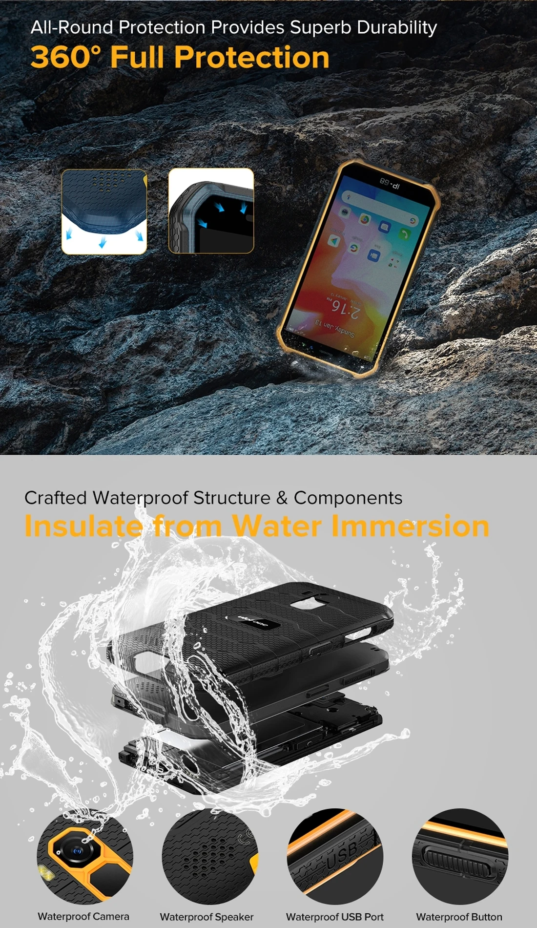 1. MTK Helio A20 MT6761VWE 4 ядра 64-бит до 1,8 ГГц Процессор, хорошая производительность, работает быстро и работать гладко.2. 5,0 дюймов 1280x720 пикселей, высокая четкость, яркие цвета, хорошо подходит для просмотра видео, игр.3. Всесторонняя защита на 360 градусов, прочная и долговечная в использовании.4. Уровень IP68/IP69K водонепроницаемый пыленепроницаемый ударопрочный, он может быть использован в широком использовании сценариев и приложений.5. Питание от литий-полимерного аккумулятора высокой емкости 4000 мАч, длительный срок службы.