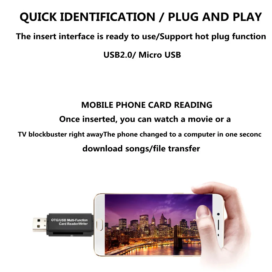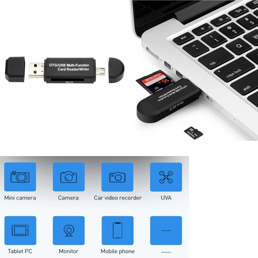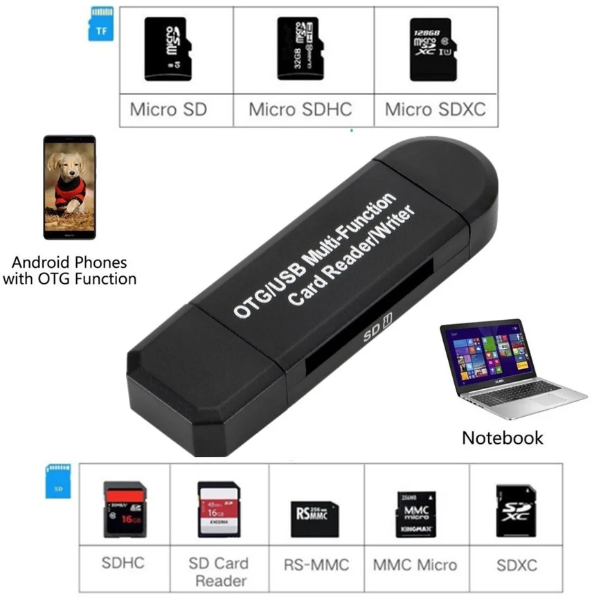 Описание:Считывайте почти все ваши карты памяти со скоростью и удобством.Отличное качество. Изготовлен из прочного высококачественного пластика и первоклассных чипов.Устройство для чтения карт памяти с OTG(Android телефон/планшет должны с функцией OTG)Резервное копирование важных фотографий, музыки, видео и списка контактовПортативный для бизнеса (удобный для работы с файлами)Средство просмотра документов для всех основных форматов файловНадежно храните и делитесь цифровым контентом, таким как фильмы, изображения и музыка с вашего телефонаСовместимость для:Все телефоны/Планшеты android с функцией OTGВсе ноутбуки/ПК с usb-портомПоддержка:SDHC (UHS-I), SDXC (UHS-I), microSD, microSDHC (UHS-I) и microSDXC (UHS-I)Системные требования:Windows XP/7/8/8.1/10/Vista/LinuxMac OS X v10.3.9 или более поздняя версияДоступный порт USB или порт micro USBПосылка:Адаптер Micro USB OTG-USB 2,0-1 шт.