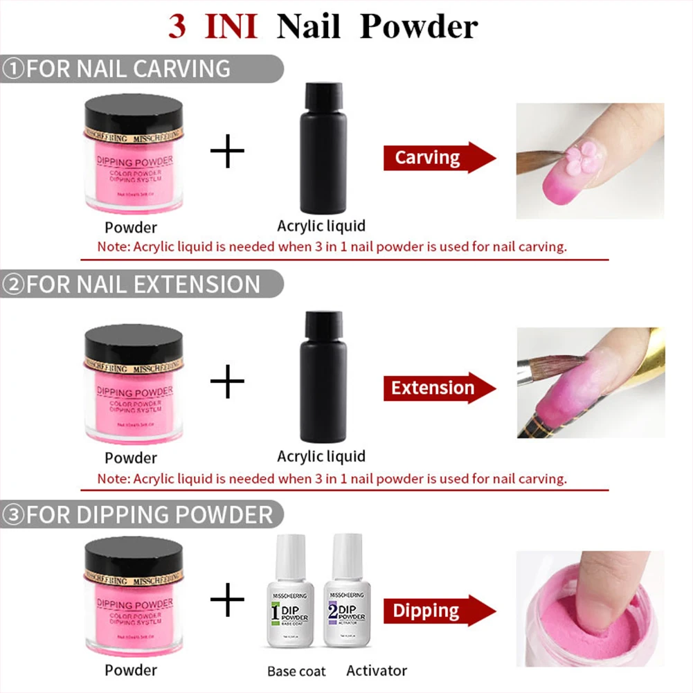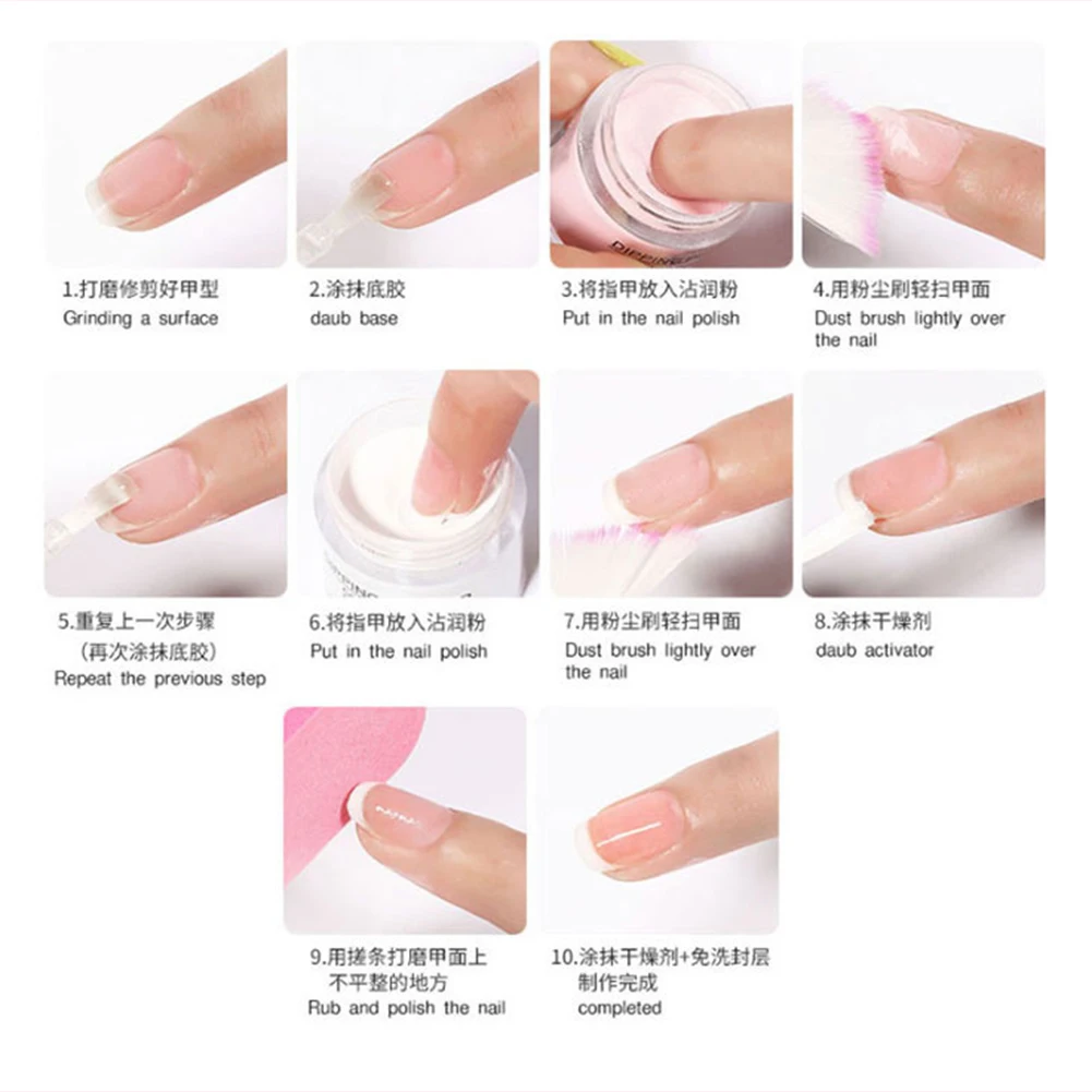 * 2. Окунающий порошок необходимо использовать вместе с базовым покрытием, верхним слоем, активатором и кистью.