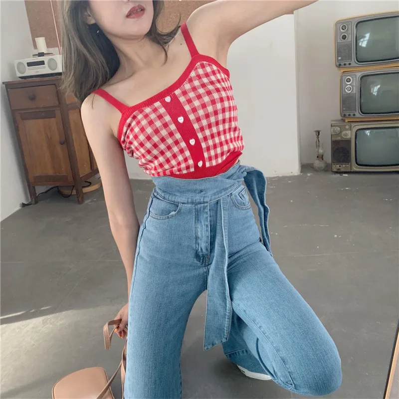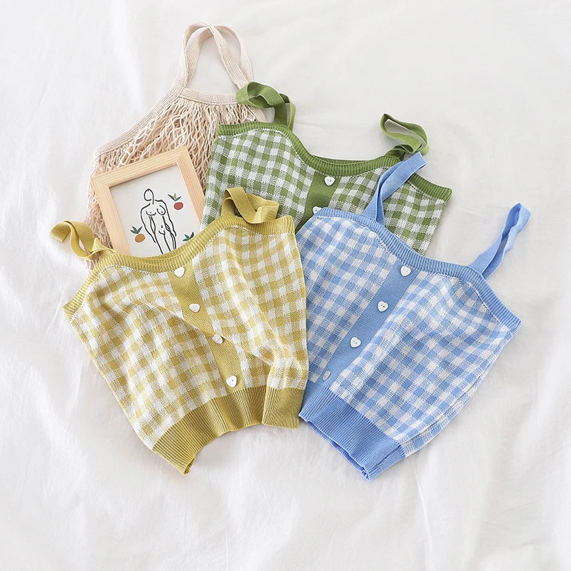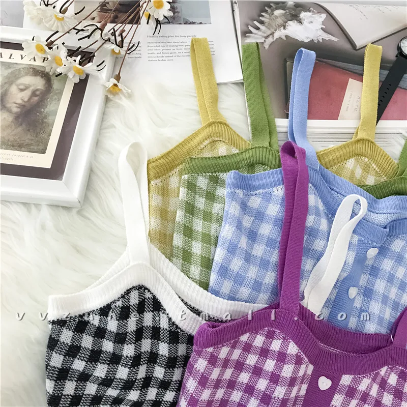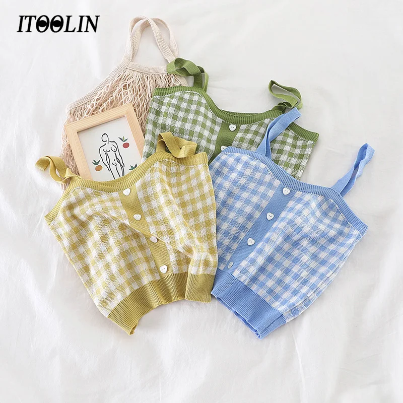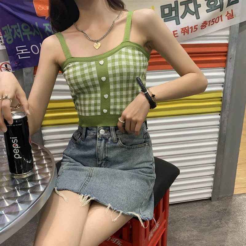 Женский укороченный топ HELIAR, вязаный клетчатый Топ на пуговицах с бретельками, милые топы на бретельках для женщин, лето 2021