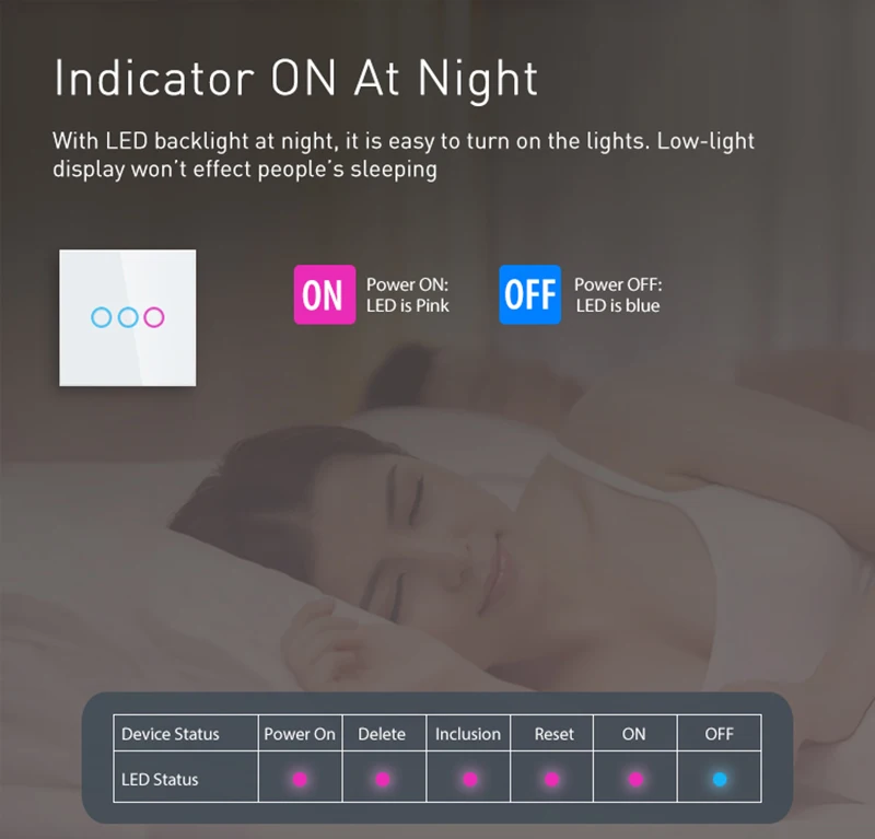 Каждый светильник имеет уникальный ID-код. Когда вы добавляете или удаляете выключатель из хоста сигнализации, просто поместите светильник в сетевой диапазон Z-wave шлюза. Низкий светильник светодиодный дисплей остается включенным в ночное время. Легко найти в темноте.