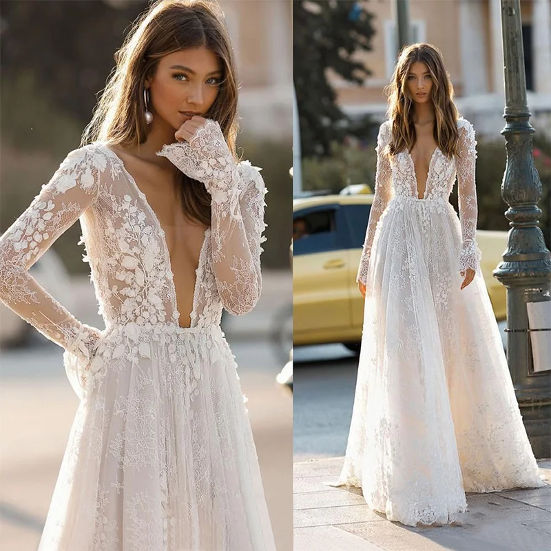 Свадебные платья, сексуальные, глубокий v-образный вырез, открытая спина, 2021, элегантные, Berta, 3D Флора, кружева, Аппликации, Пляжное свадебное платье на заказ, халат De Mariee