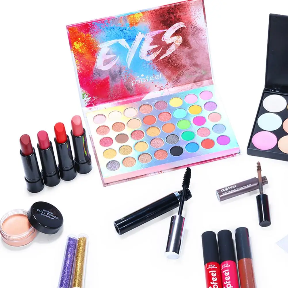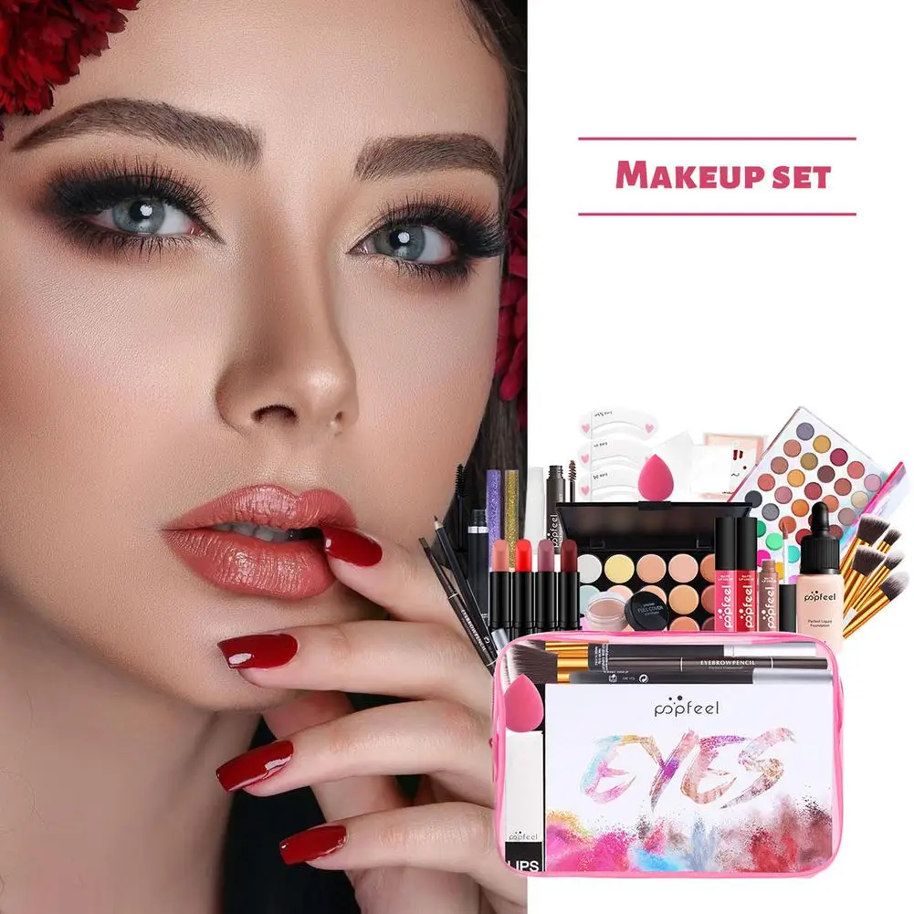 Горячая Распродажа, все в одном, профессиональный набор для макияжа, тени для век, помада, Кисть для макияжа, консилер, пудра, карандаш для бровей с переноской