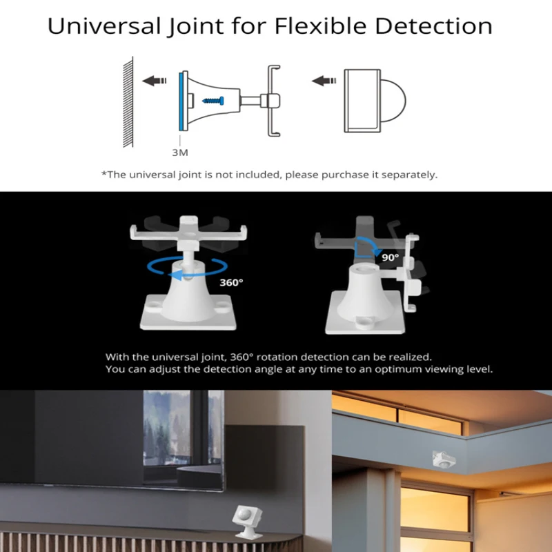 С универсальным соединением, датчик может быть гибким, чтобы вращать полный 360 ° Горизонтальный угол и 90 ° Вертикальный угол, который позволяет регулировать датчик в оптимальный угол, чтобы просмотреть все в вашем доме (датчик не двигается самостоятельно на основе ваших предложений). Еще одним удобством для вашего дома является то, что вы можете использовать датчик для положения, где движение не легко быть обнаружено путем установки его в универсальном соединении, И просто поверните универсальную шарнирную головку, чтобы получить прекрасный угол обнаружения. Кроме того, вы можете непосредственно наклеить датчик на поверхность объектов для обнаружения движения. Просто выберите тот, который вам нравится.