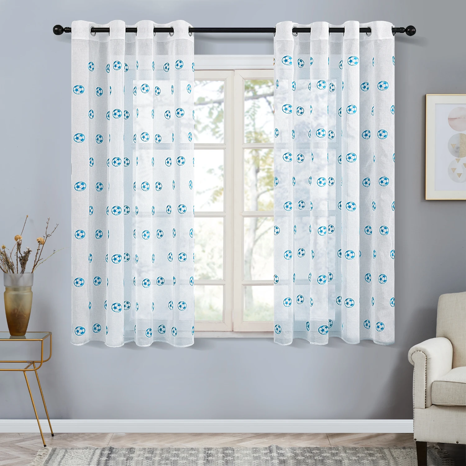 Короткие Прозрачные шторы для гостиной, спальни, детской комнаты, вышитые футбольные тюли для спальни, оконные шторы, бирюзовые