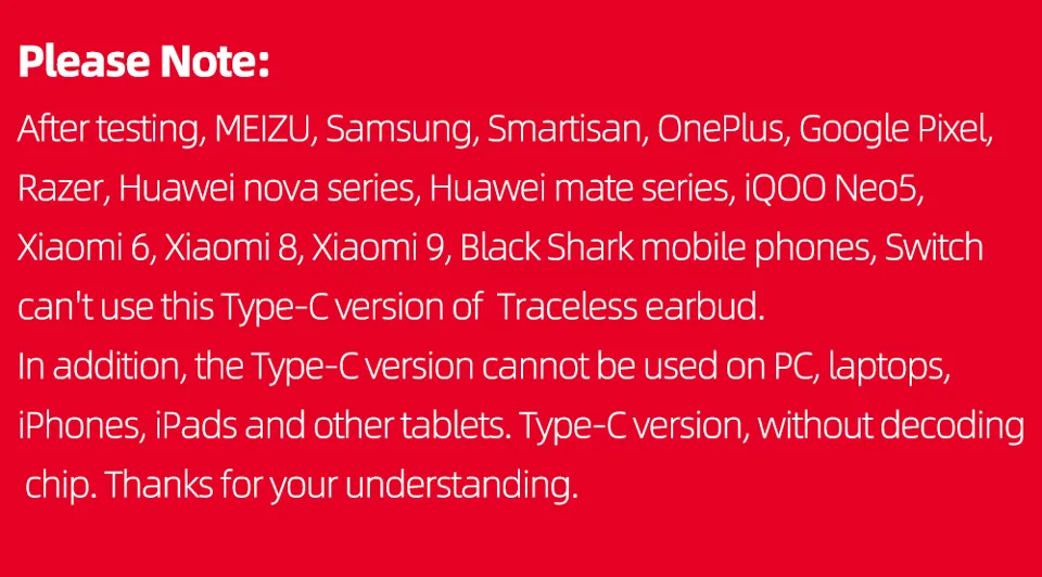 Ситуация③После тестирования,MEIZU,Samsung,Smartisan,OnePlus, Google pixel,Razer, серия Huawei nova, Серия Huawei mater, IQOO neo5, Xiaomi 6, Xiaomi 8, Xiaomi9, мобильные телефоны Black shark, Switch Нельзя использоватьЭта версия наушников Type-C без следов. Спасибо за понимание.