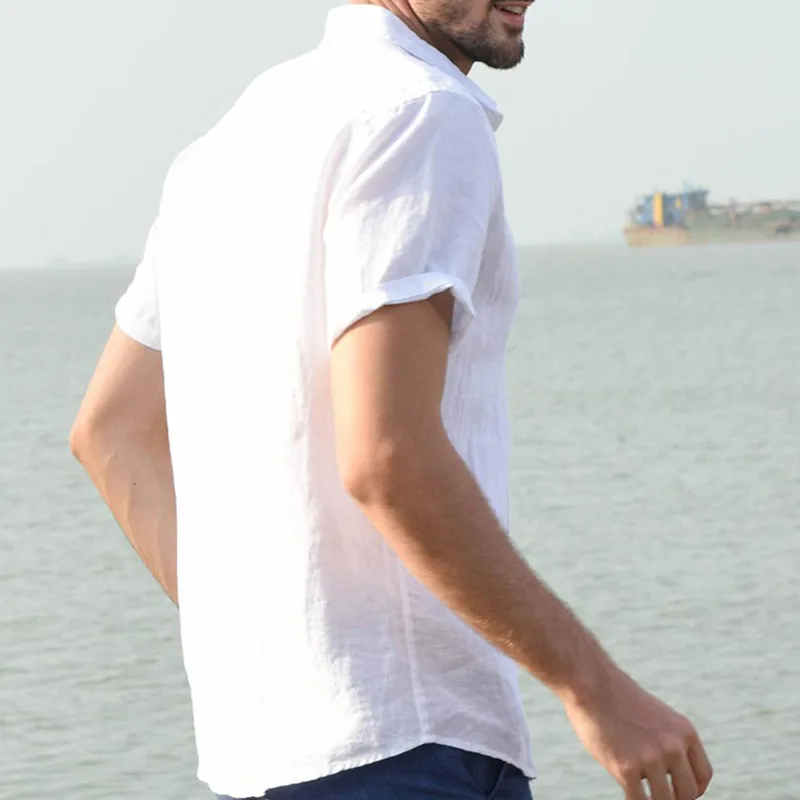 Рубашка Мужская льняная с коротким рукавом, Свободная блуза с лацка...