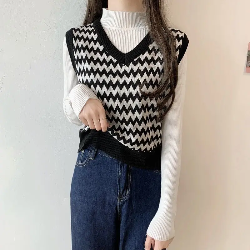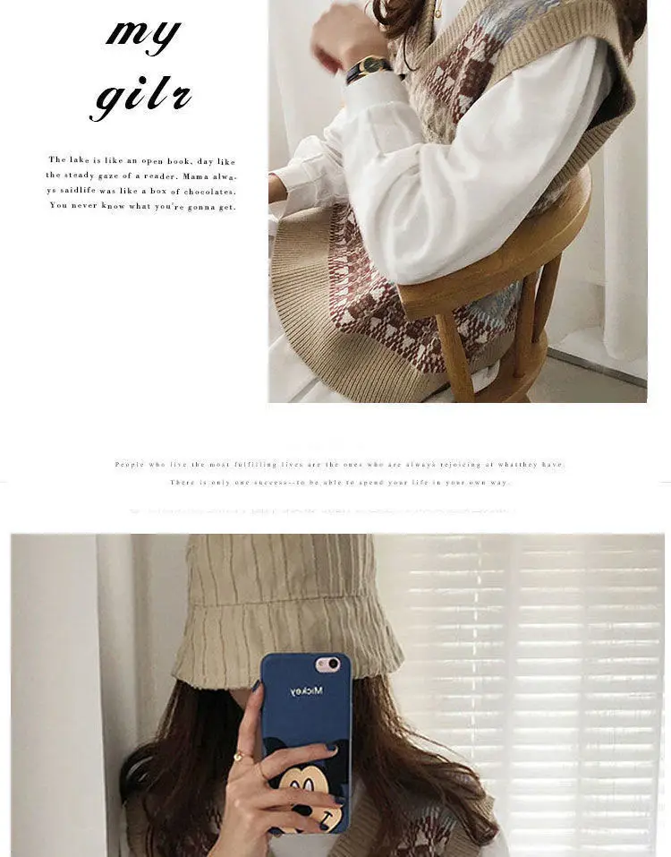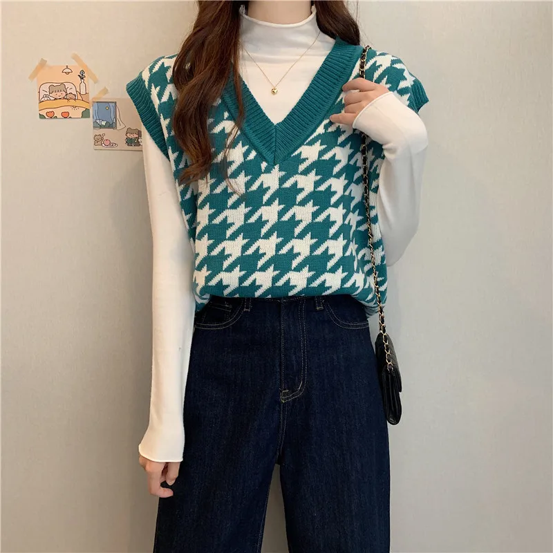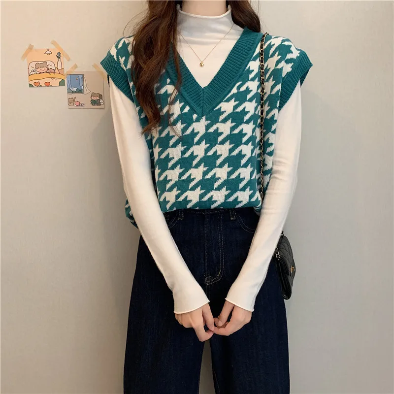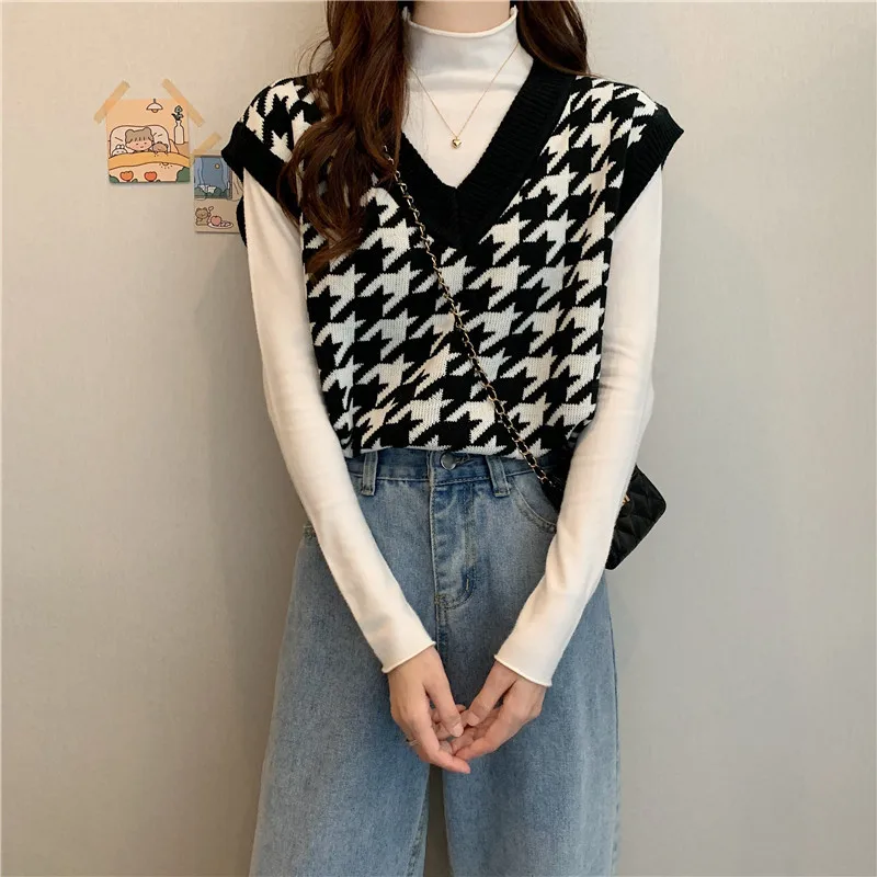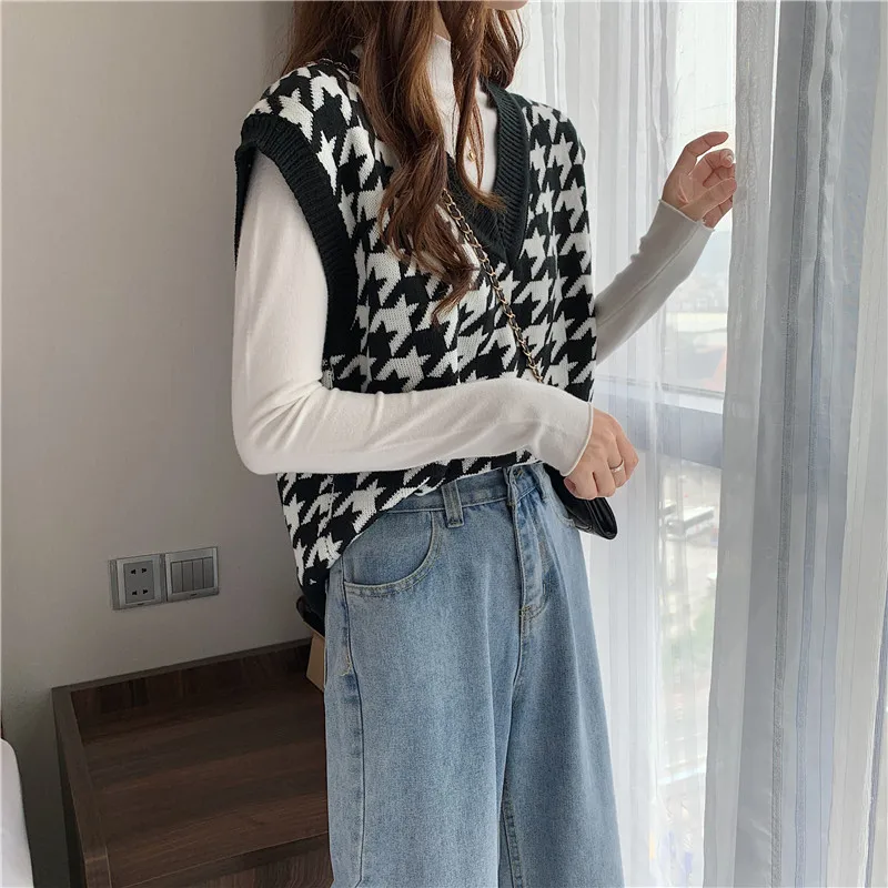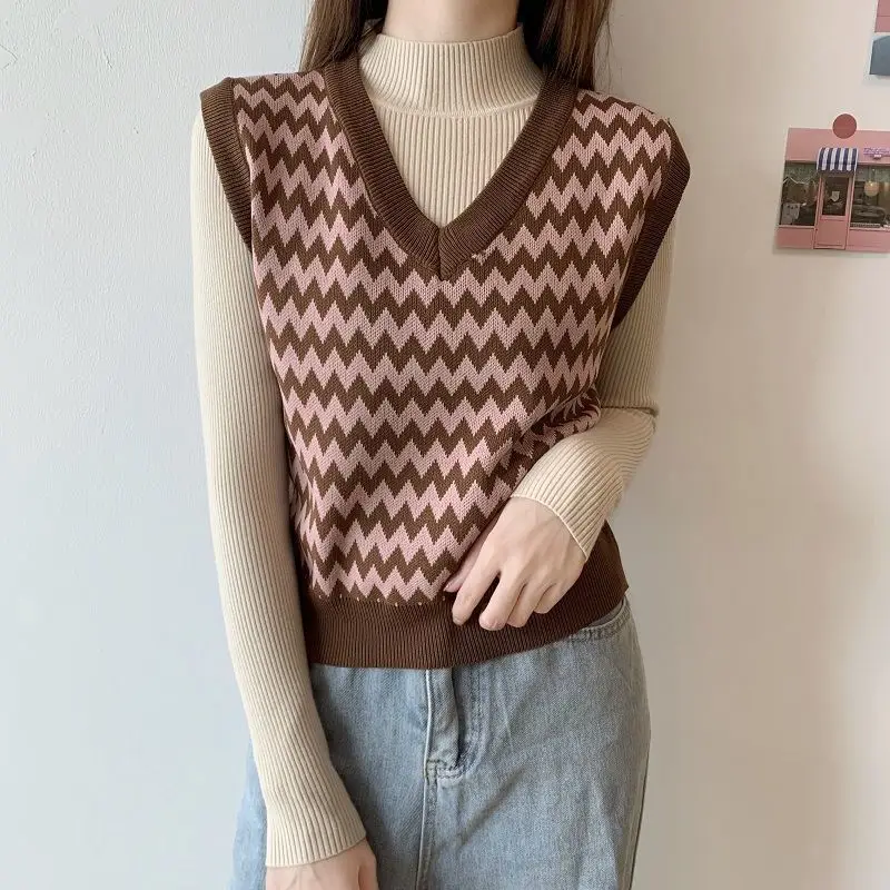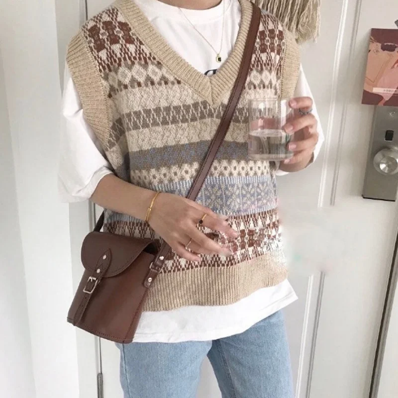 Женский винтажный свитер-жилет с принтом и V-образным вырезом