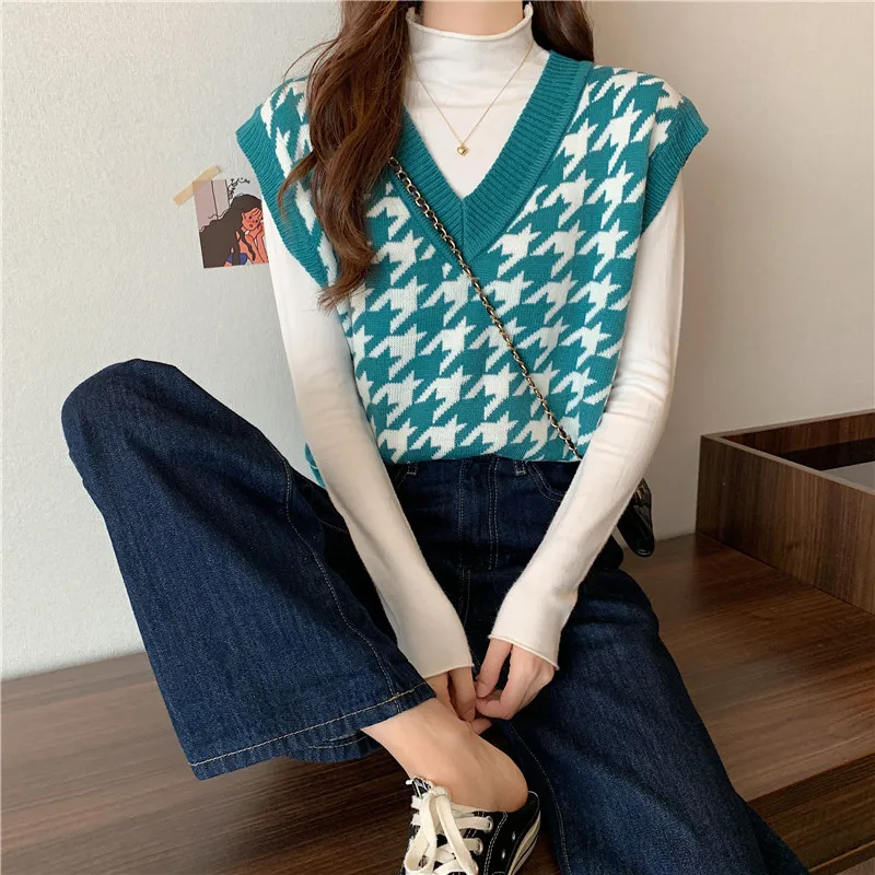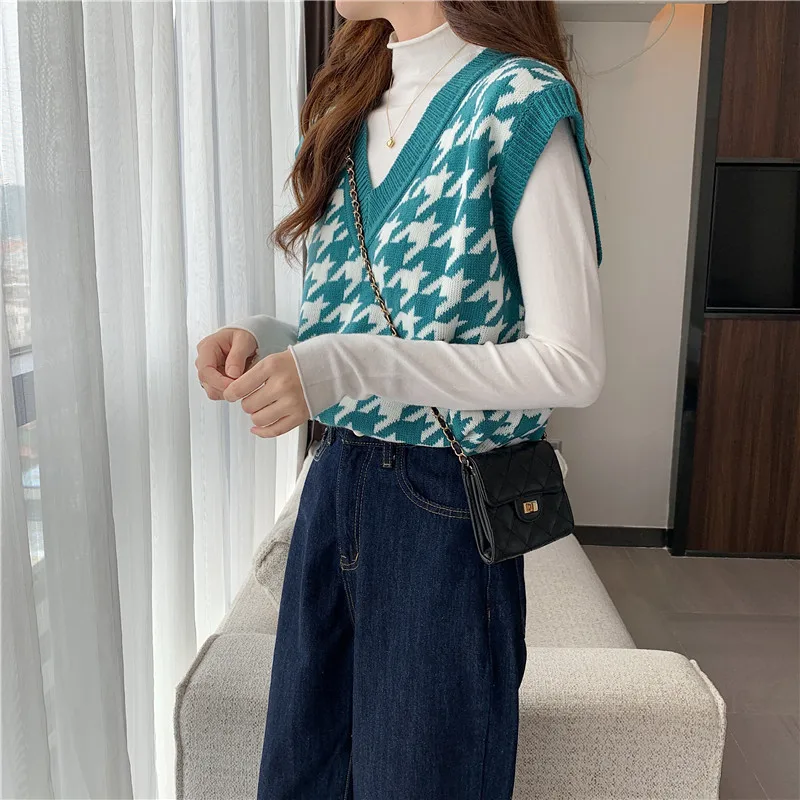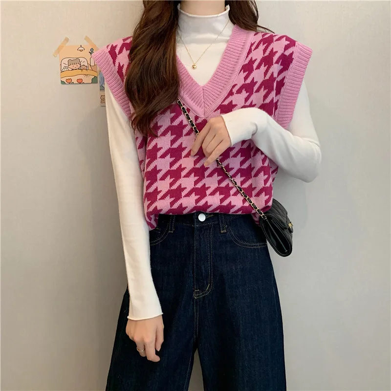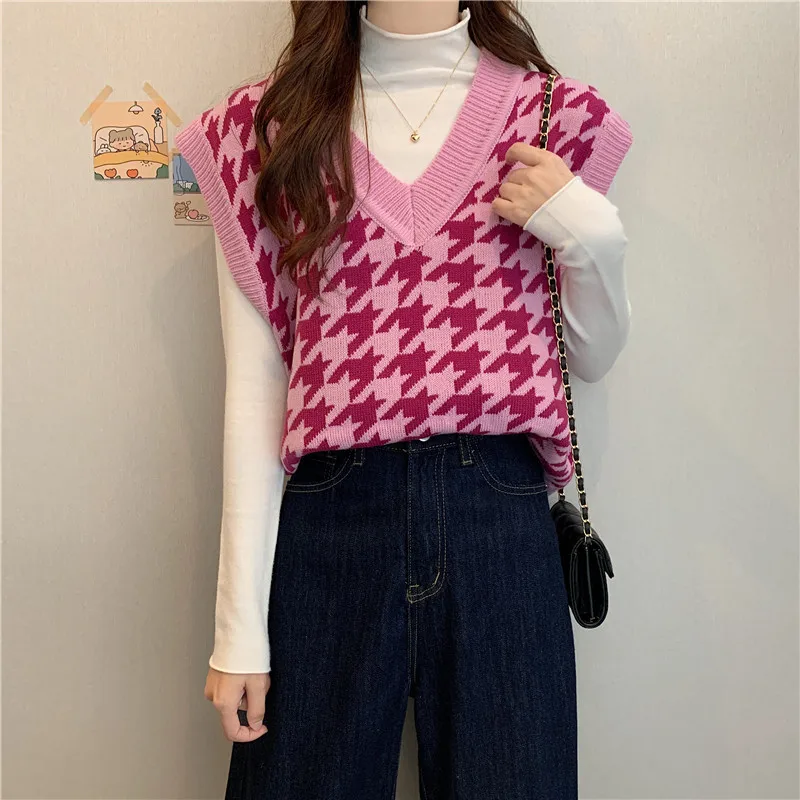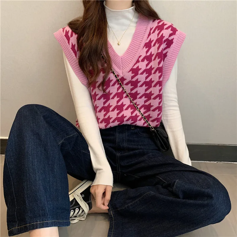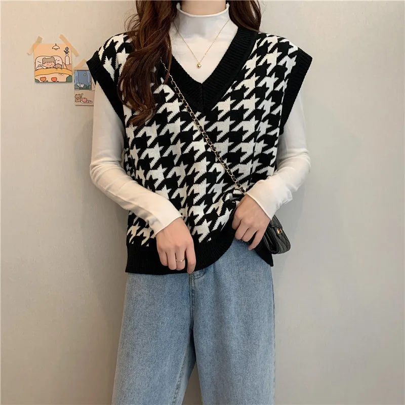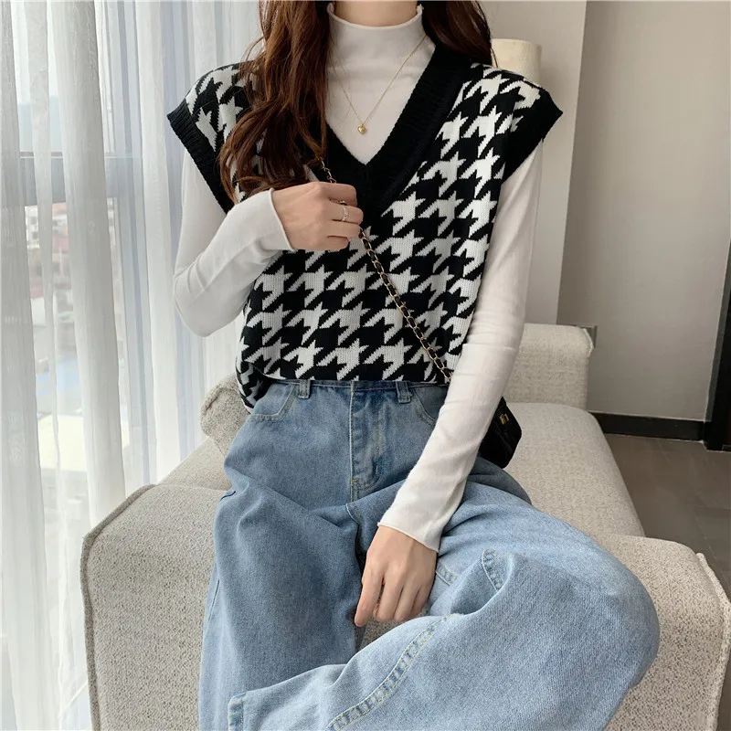 Женский вязаный жилет без рукавов, свободный клетчатый пуловер с V-...