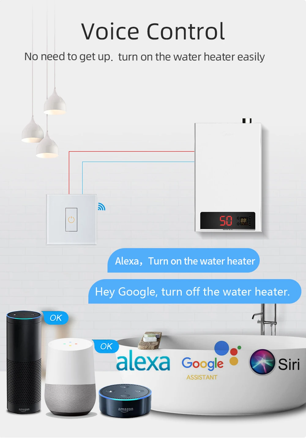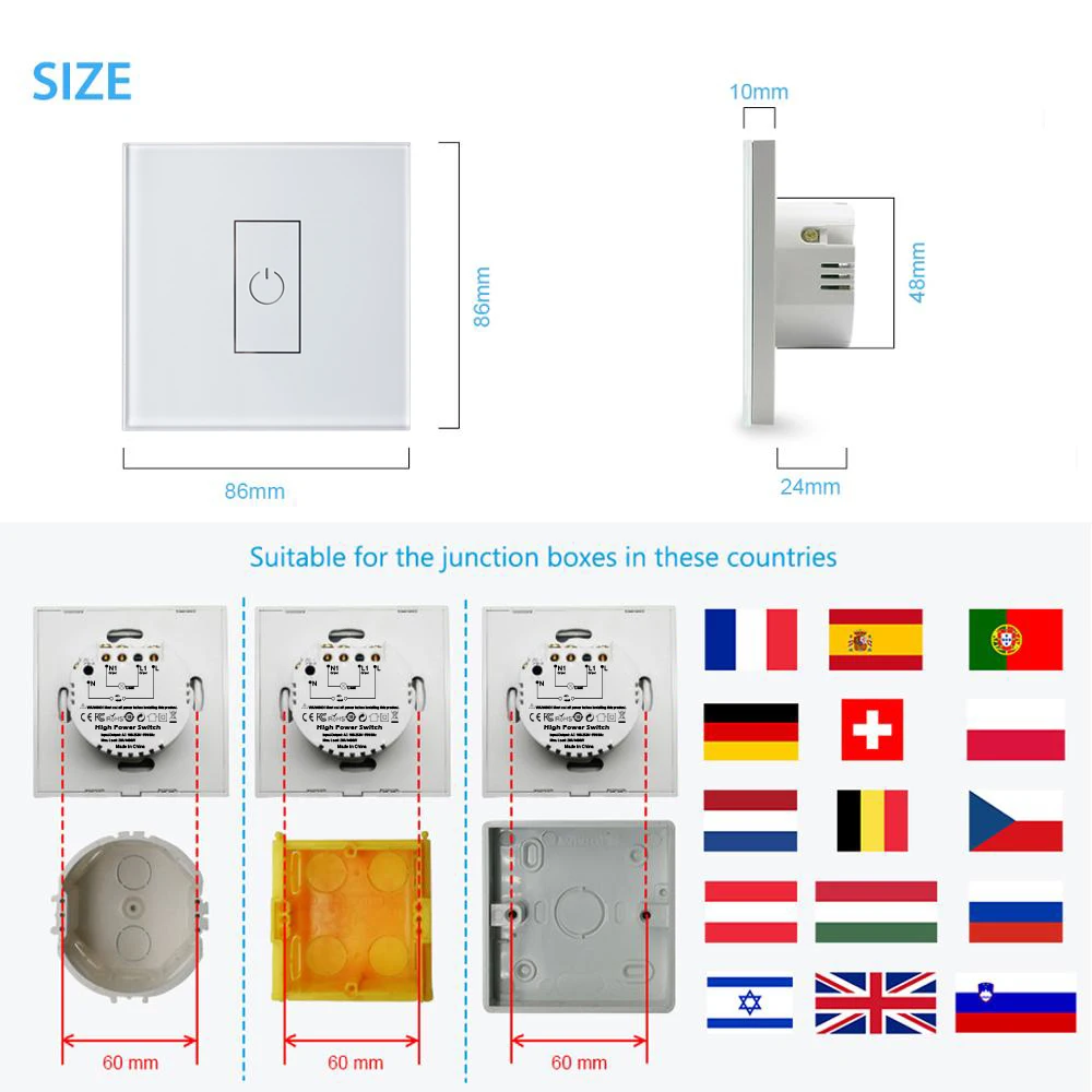 Specialized специализированный переключатель для высокомощной бытовой техникиВысокое качество 20А реле, более стабильное и безопасное, макс. 4400 Вт※ Сенсорная панель из закаленного стеклаСенсорная кнопка высокой чувствительности, быстрая реакция, без задержекRemote дистанционное управление с помощью приложения из любого местаУправление (включение/выключение, Установка таймера) устройство удаленно с помощью приложения «Smart Life»/«Tuya Smart» на вашем смартфоне с помощью Wi-Fi или сети 4G/5G, не требуется концентратор/шлюз. ※ Голос УправлениеРаботает с Amazon Alexa, Google Home и Siri(iOS 12,0 или более поздней версии), вы можете управлять голосовым устройством через голосовые команды.※ Многофункциональный таймер:Обратный отсчет/Расписание/циркуляция/случайный/инчинг-Вы можете установить 1 или более таймер, чтобы сделать бойлер включенным/выключенным автоматически, или работать в течение определенного периода времени, а затем автоматически закрыть.Совместно совместно используемое устройство и групповое управлениеНесколько сотовых телефонов могут управлять одним и тем же переключателем котла; Один мобильный телефон может управлять несколькими переключателями одновременно.