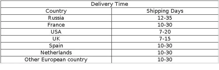 Мы отправим вам товар авиапочтой Китая или Epacket. Франция, Испания, Нидерланды и чили мы отправим вам Aliexpress доставку. Если вам нужна более быстрая доставка, пожалуйста, выберите DHL, FedEx, Aramex, EMS, и мы отправим его в ближайшее время.