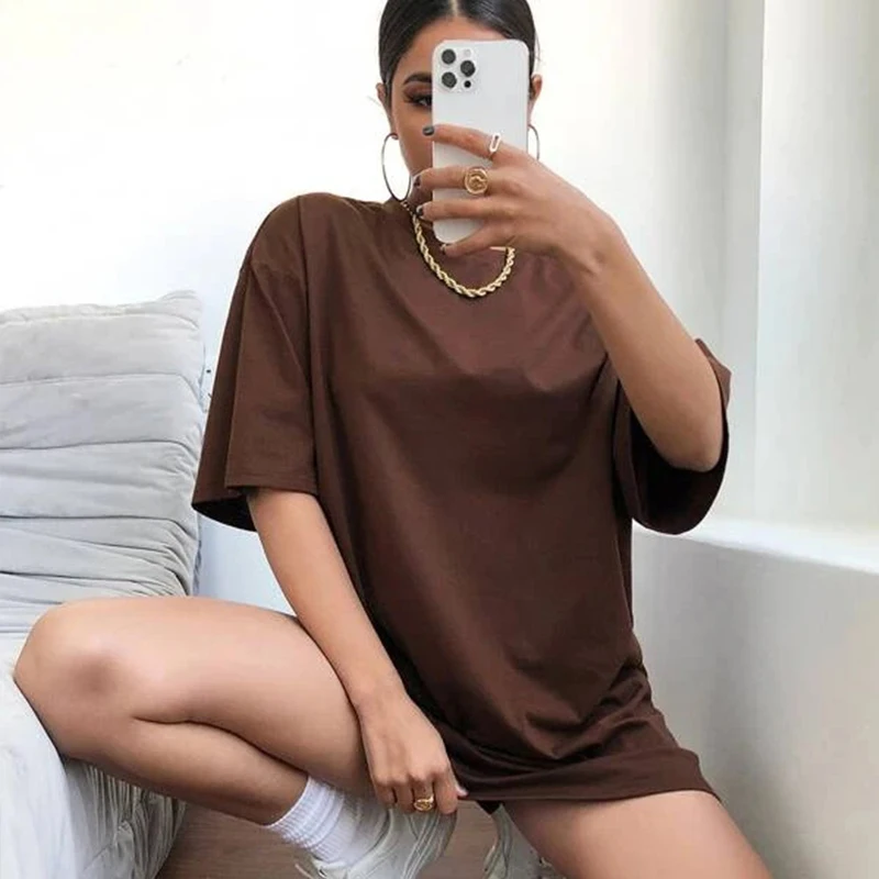 Футболка женская оверсайз с круглым вырезом, простая однотонная Пов...