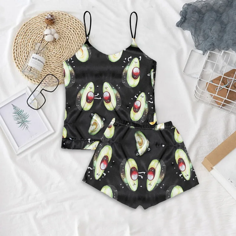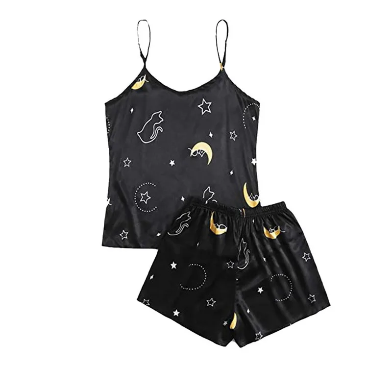 Особенности: женский пижамный комплект с принтом; Комплект из двух предметов; Майка без рукавов с эластичной резинкой на талии; Шорты с принтом; Женская домашняя одежда