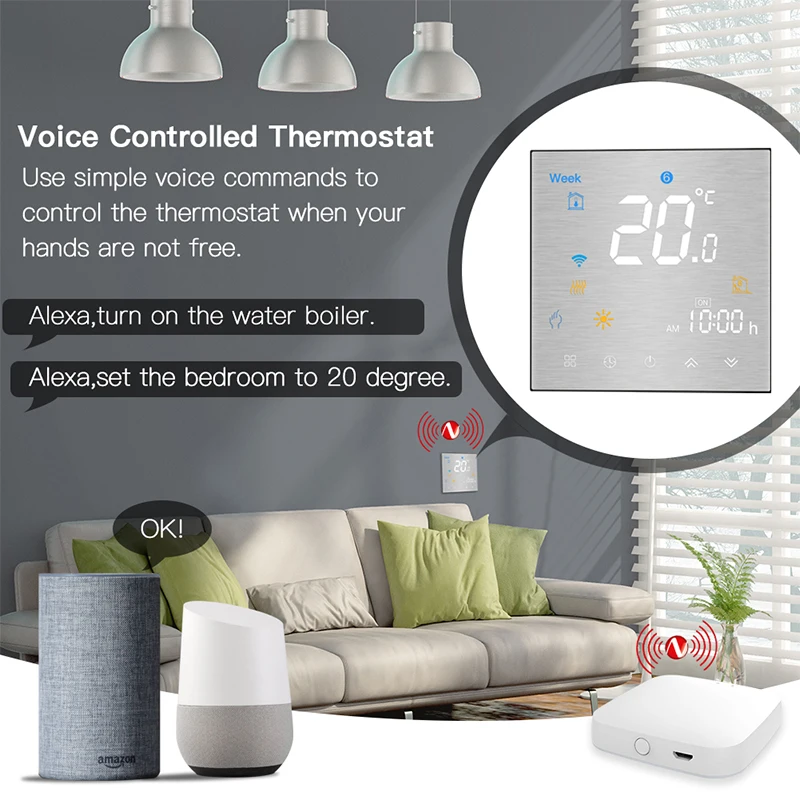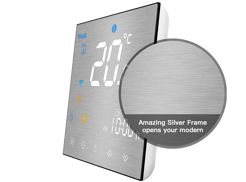 ZigBee умный металлический термостат с матовой панелью Программируемый Регулятор температуры для нагрева воды/электрического напольного отопления/водного газового котла Tuya ZigBee Hub требуется Alexa Google Home Голосовое управление Smart Life App беспроводной пульт дистанционного управленияОсновные характеристики:1. Требуется функциональное водонагревание с ZigBee Hub:Управление с помощью протокола ZigBee включает в себя интеллектуальное нагревание воды, обеспечивая максимальное и всестороннее удобство вашей умной жизни. Концентратор Tuya ZigBee необходим для нормального использования и мостового сетевого центра для всех устройств ZigBee для соединения всего дома, отличающегося гораздо большей совместимостью с нашим термостатом ZigBee, чем с любыми другими концентраторами ZigBee.(Примечание: текущая нагрузка составляет 5А для водного пола и газовой котельной системы, 16А для электрического напольного отопления)2. Металлическая матовая панель:Потрясающая Серебристая Рамка и цветной цифровой дисплей открывают вашу современную жизнь, а квадратный дисплей также помогает защитить ваши глаза. Термостат сфокусирован на создании простых, человеческих, восхитительных ощущений для вашего дома, и этот вид цвета подходит для различных стилей декора.3. Умный дом совместим:Работает с Alexa Google Home, термостат предлагает наиболее удобную температуру воды для себя, где бы вы ни находились, используя Голосовое управление под приложением Tuya Smart Life, подключенным для интеллектуального управления.4. Пульт дистанционного управления для смартфона:Беспроводной пульт дистанционного управления водяным полом/электрическим отоплением и температурой водного газового котла для достижения повышенного комфорта через ваше умное приложение, легко работать на смартфонах, где бы вы ни находились.5. 5 + 2 программируемые:Поддерживает полные автоматические программы или ручную настройку 5 + 2 дней еженедельного расписания 6 этапов ежедневно, обеспечивая вам максимальное удобство и комфорт. Память данных при выключении питания.Параметр:Источник питания: 95 ~ 240 В переменного тока, 50 ~ 60 ГцТок: 5A (для водного пола и системы газового котла)/ 16A (для электрического напольного отопления)Точность: 0,5 ℃Установите температуру. Диапазон: 5 -35 ℃Температура экрана. Диапазон: 5 ~ 95% RH (без конденсации)Температура хранения: -5 ~ 45 ℃Мощность Потребляемая мощность: менее 1,5 ВтОшибка синхронизации: менее 1%Материал корпуса: поликарбонат + АБС (огнестойкий)Установочная коробка: 86 * мм квадратная или европейская 60 мм круглая коробкаПроволочные выводы: провода 2x1,5 mm2 или 1x2,5 mm2Класс защиты: IP20Кнопки: емкостные сенсорные кнопкиУпаковочный лист:Умный термостат (по вашему выбору) * 1 + винт * 2 + Руководство по быстрой установке * 1 + контроль качества * 1
