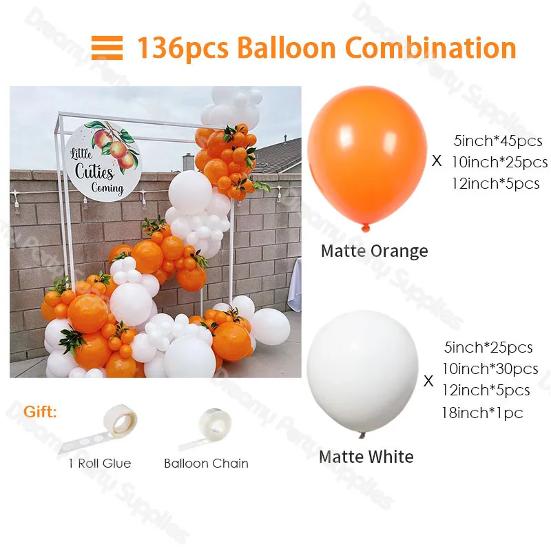 Матовый оранжевый(5 дюймов * 45 шт., 10 дюймов * 25 шт., 12 дюймов * 5 шт.)Матовый белый(5 дюймов * 25 шт., 10 дюймов * 30 шт., 12 дюймов * 5 шт., 18 дюймов * 1 шт.)Бесплатно: 1 рулонный клейЦепочка для воздушных шаров