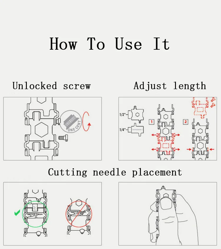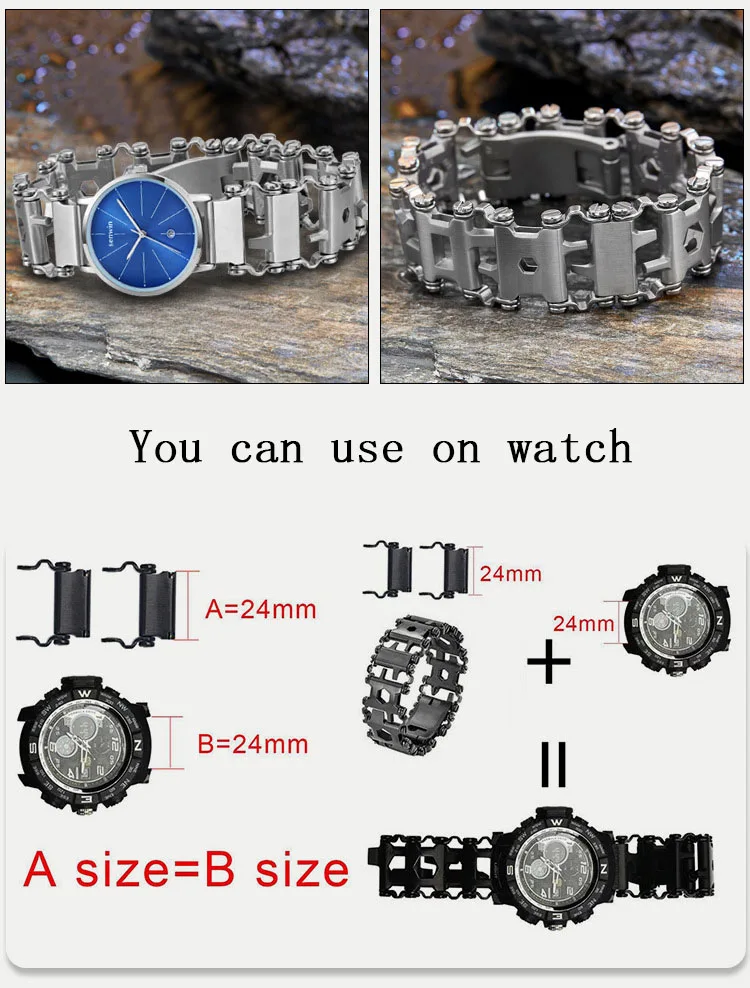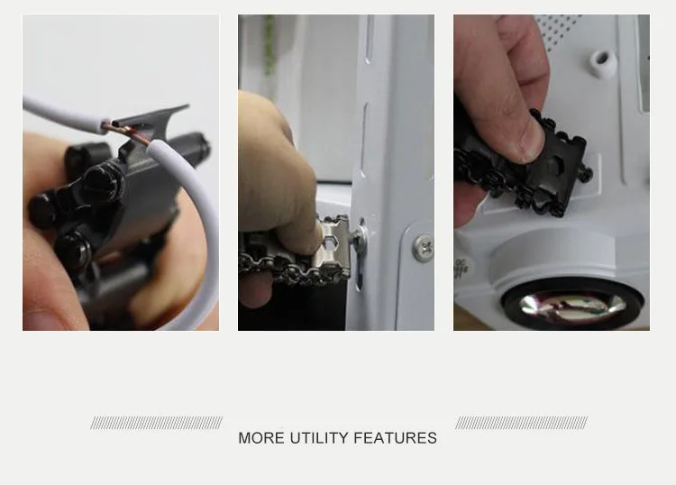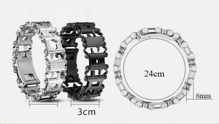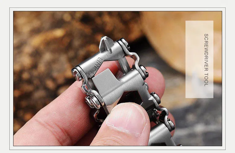 Характеристики: 1. Каждая секция стальной цепи равна инструменту, включая отвертку, консервный нож, открывалку для бутылок, открывалку, шестигранный ключ. 2. Вы можете случайным образом объединить все 29 стальных цепей для различных функций или уменьшить некоторые секции для браслета. 3. 29 различных инструментов в 10 звеньях могут быть собраны несколькими способами, чтобы настроить этот многофункциональный инструмент для удовлетворения ваших потребностей. 4. Изготовлено из прочной нержавеющей стали, это инструмент, идеально подходящий для кемпинга на открытом воздухе или пеших прогулок. Характеристики: Материал: нержавеющая сталь специальная обработка функция: 29 функций Применение: туризм, кемпинг аварийные инструменты, гаджеты для ремонта дома и т. д. цвет изделия: серебристый и черный Вес изделия: 170 г