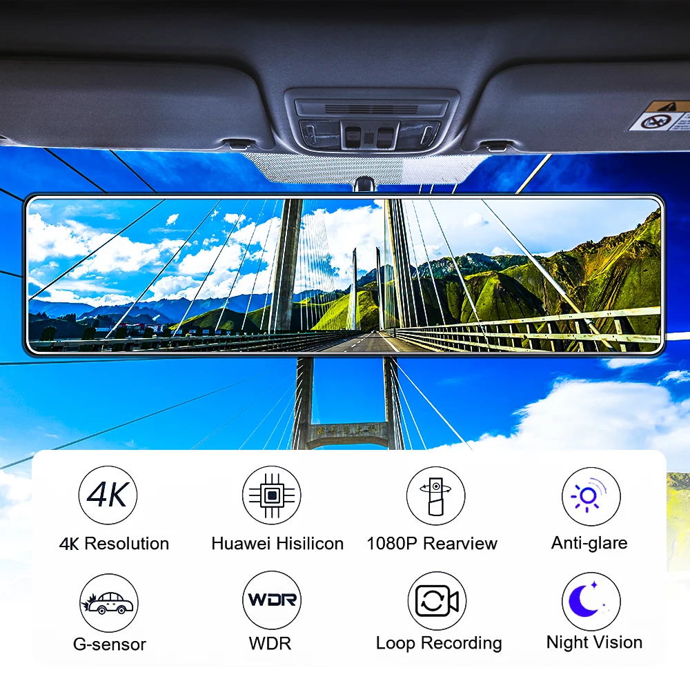 Применение: 4K Камера, потоковый медиа зеркало заднего вида, а также отличное ночное видение, видео, 24 часа в сутки для парковочной системы, столкновения сенсор, передние и задние двойные видео (широкий динамический диапазон), циклическая запись, Adjustabl угол обзора, Специальное крепление держатель