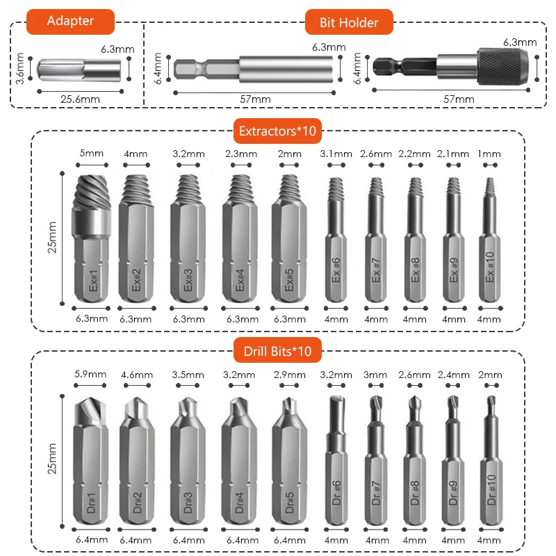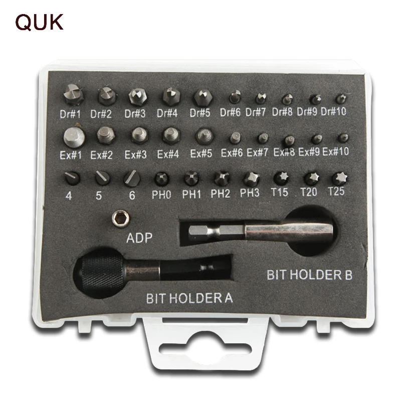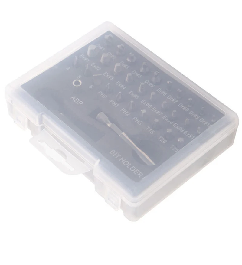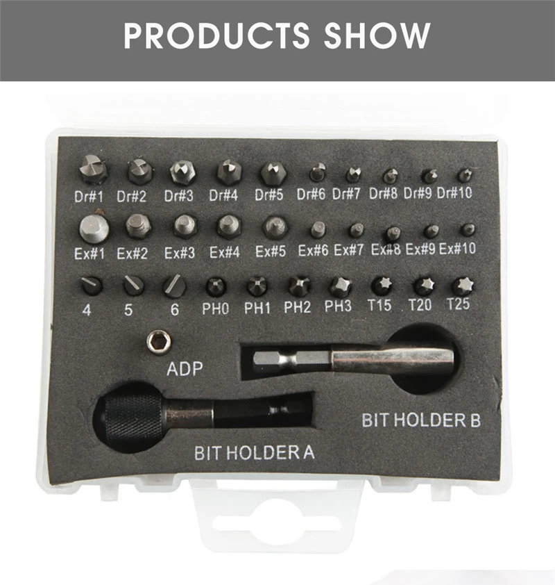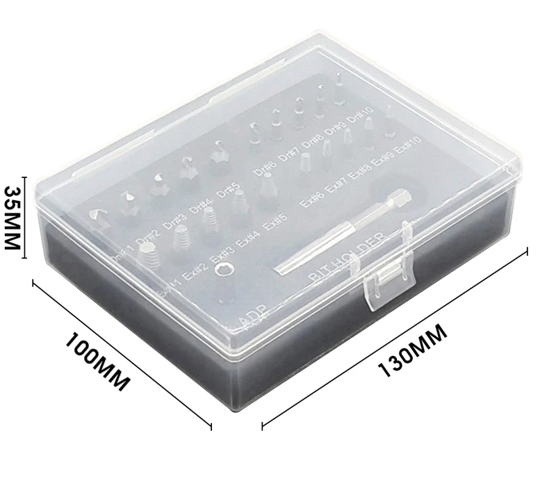 Спецификация:Вес: 198 г (22 в 1) / 270 г (33 в 1)Размер коробки: 130 мм * 100 мм * 35 ммАксессуары:Сверла * 10:Dr #1/Dr #2/Dr #3/Dr #4/Dr #5/Dr #6/Dr #7/Dr #8/Dr #9/Dr #10Экстракторы * 10:Ex #1/Ex #2/Ex #3/Ex #4/Ex #5/Ex #6/Ex #7/Ex #8/Ex #9/Ex #10Щелевые биты * 3: SL4/SL5/SL6Phillips биты * 4: PH0/PH1/PH2/PH3Torx биты * 3: T15/T20/T25Адаптер для бит * 1Держатели для бит * 2