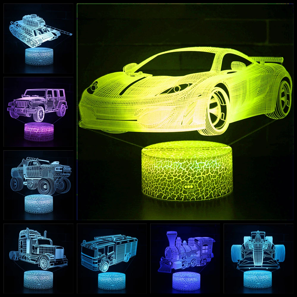 3D ночной Светильник, поезд, спортивный автомобиль, экскаватор, грузовик, бульдозер, танк, детский ночсветильник, игрушка, модель, украшения, светодиодное украшение, подарки