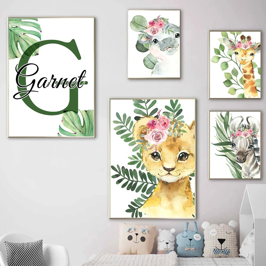 Индивидуальное название плаката, печать ребенка, тигр, Лев, жираф, Зебра, животные, настенное искусство, персонализированная Картина на холсте для детей