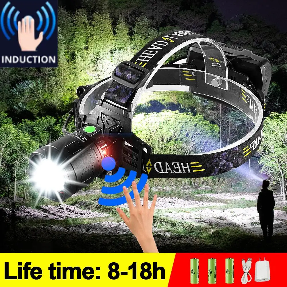 ИК Сенсор светодиодный налобный фонарь 18650 мощный головная лампа вспышка светильник Перезаряжаемые спереди светодиодный головной светильник USB рыбалка лампы можно использовать 18 часов