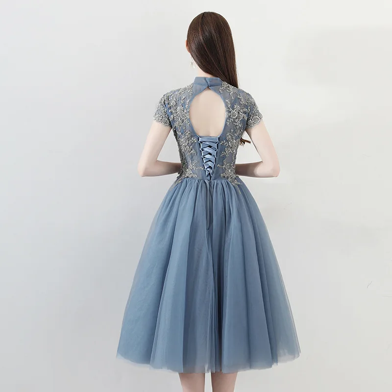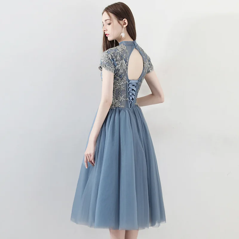 Короткое голубое вечернее платье-трапеция с аппликацией и высоким воротом, элегантное платье длиной ниже колена с коротким рукавом для выпускного вечера Вечерние вечернее платье с вырезом на спине и шнуровкой
