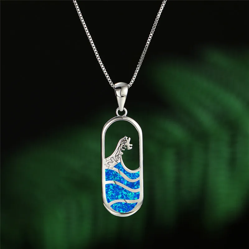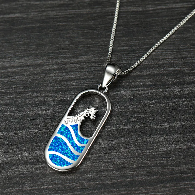 Классический синий имитация опала кулон для женщин Серебряный цвет цепочка Ожерелье полые волны Свадебные ювелирные изделия
