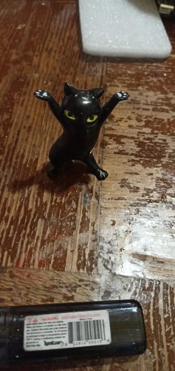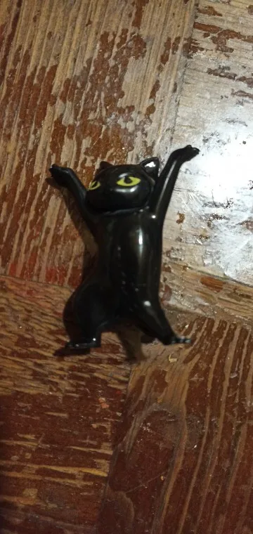 Шли три месяца, я уже думал не дойдут. Сами котята неплохие, не очень хрупкие. Стоят на поверхности хорошо, но что-то держат не очень устойчиво. Да и ладно, всё равное для развлечения. Чёрный кот в каких-то небольших белёсых разводах, и на нём не видно ничего, кроме глаз.